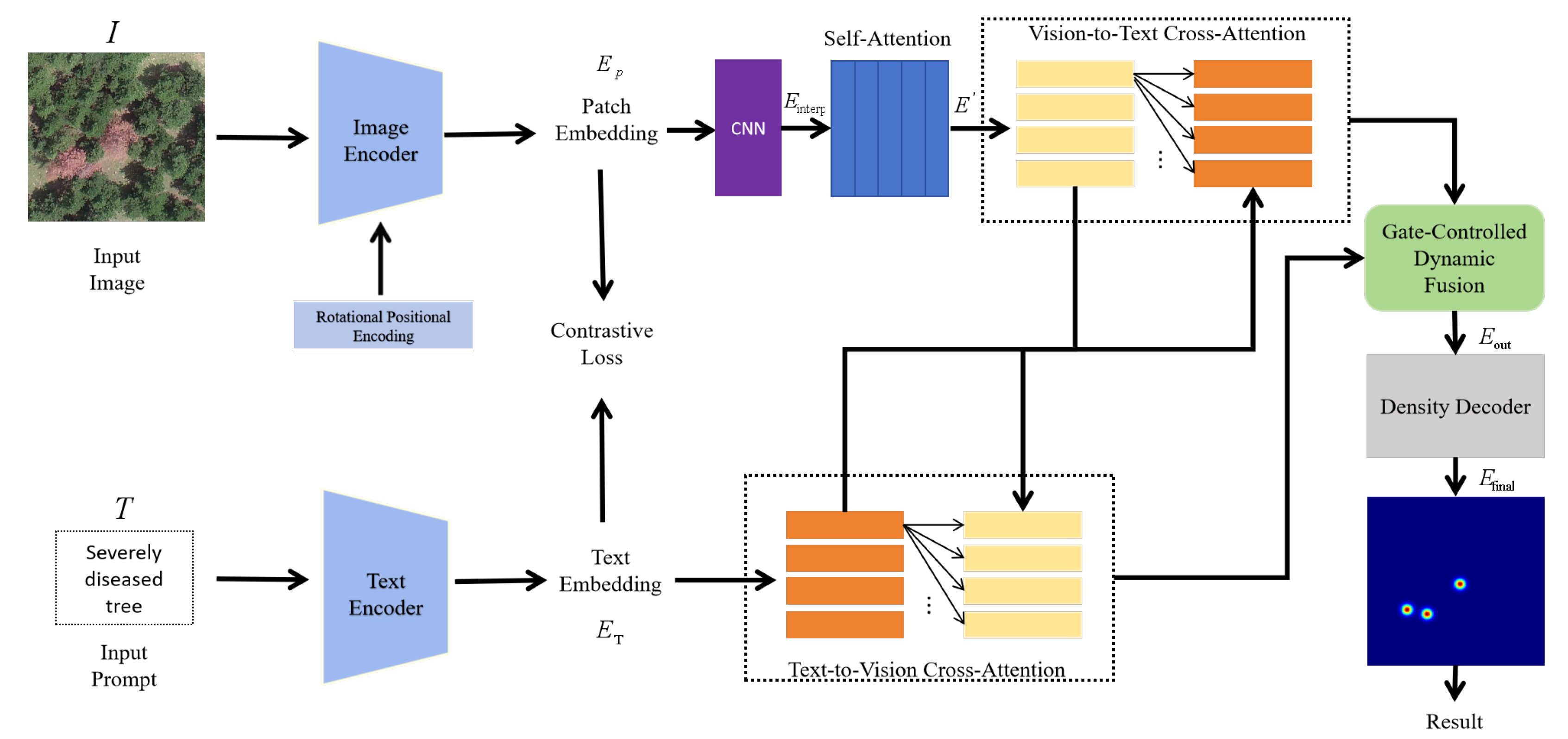 In this paper, we further improved the CLIP model by introducing rotational position encoding in the image encoder to improve the model’s ability to perceive diseased trees at different locations in the image, realized multimodal feature alignment and fusion through the gated bidirectional cross-attention module and the contrast loss function, utilized the decoder to generate the corresponding density map information for quantity counting, and ultimately constructed a deep learning model for diseased tree counting.