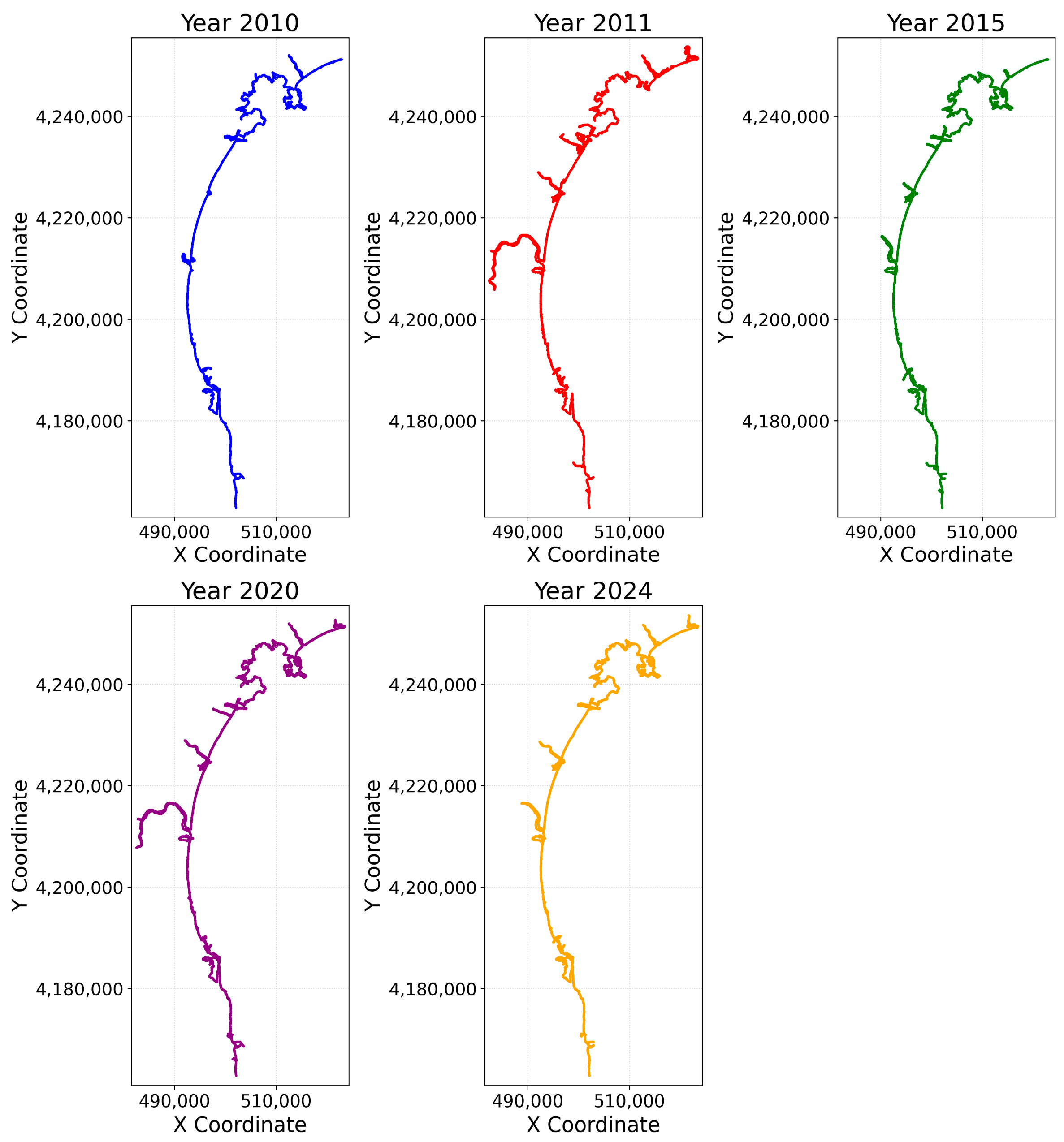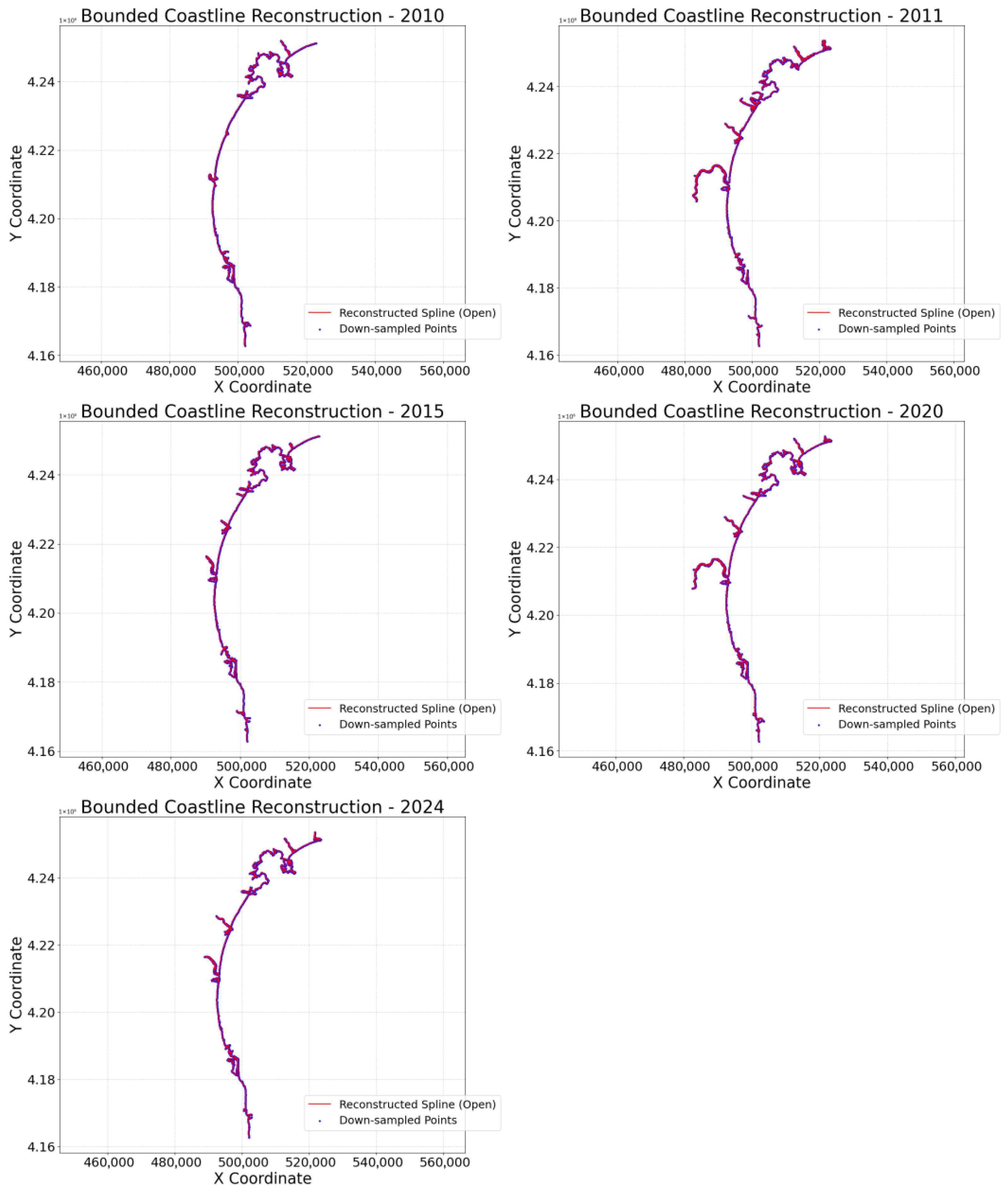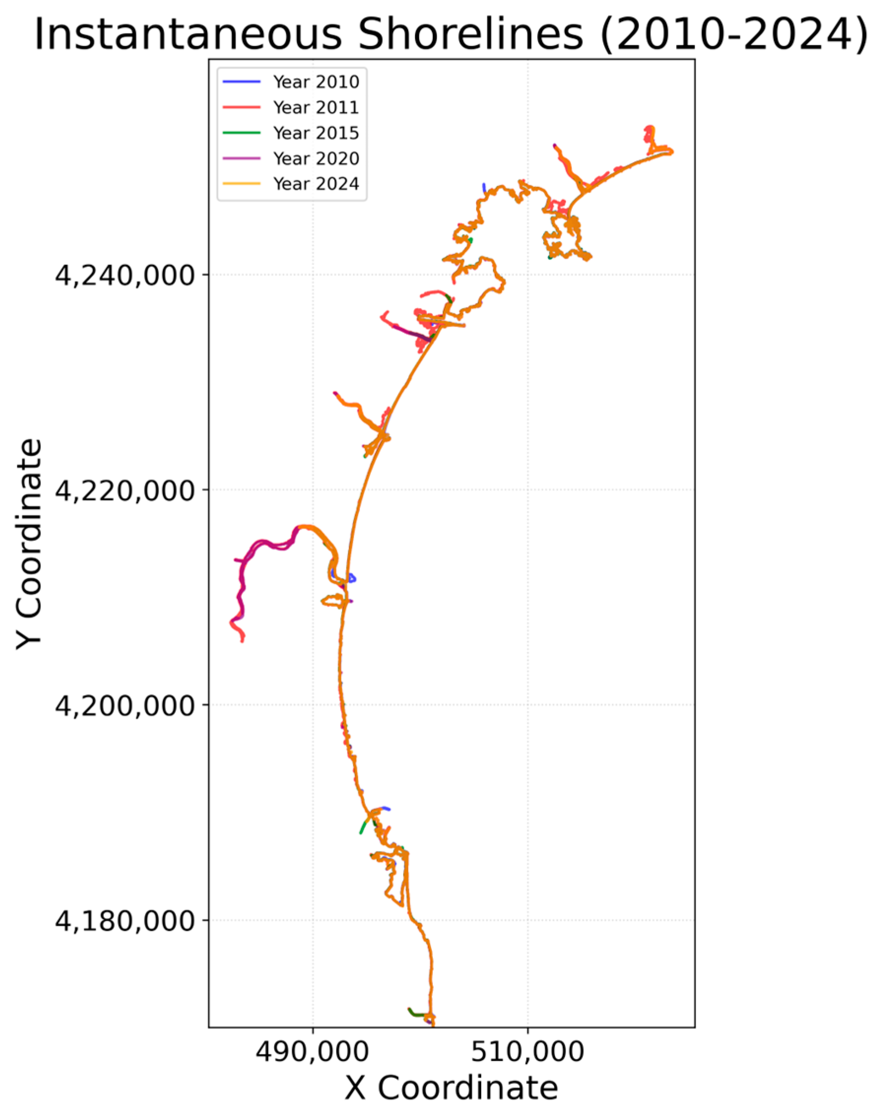 - Thieler, E.R.; Himmelstoss, E.A.; Zichichi, J.L.; Ergul, A. The Digital Shoreline Analysis System (DSAS) Version 4.0—An ArcGIS Extension for Calculating Shoreline Change; US Geological Survey: Reston, VA, USA, 2009. Available online: https://pubs.usgs.gov/publication/ofr20081278 (accessed on 25 November 2025).