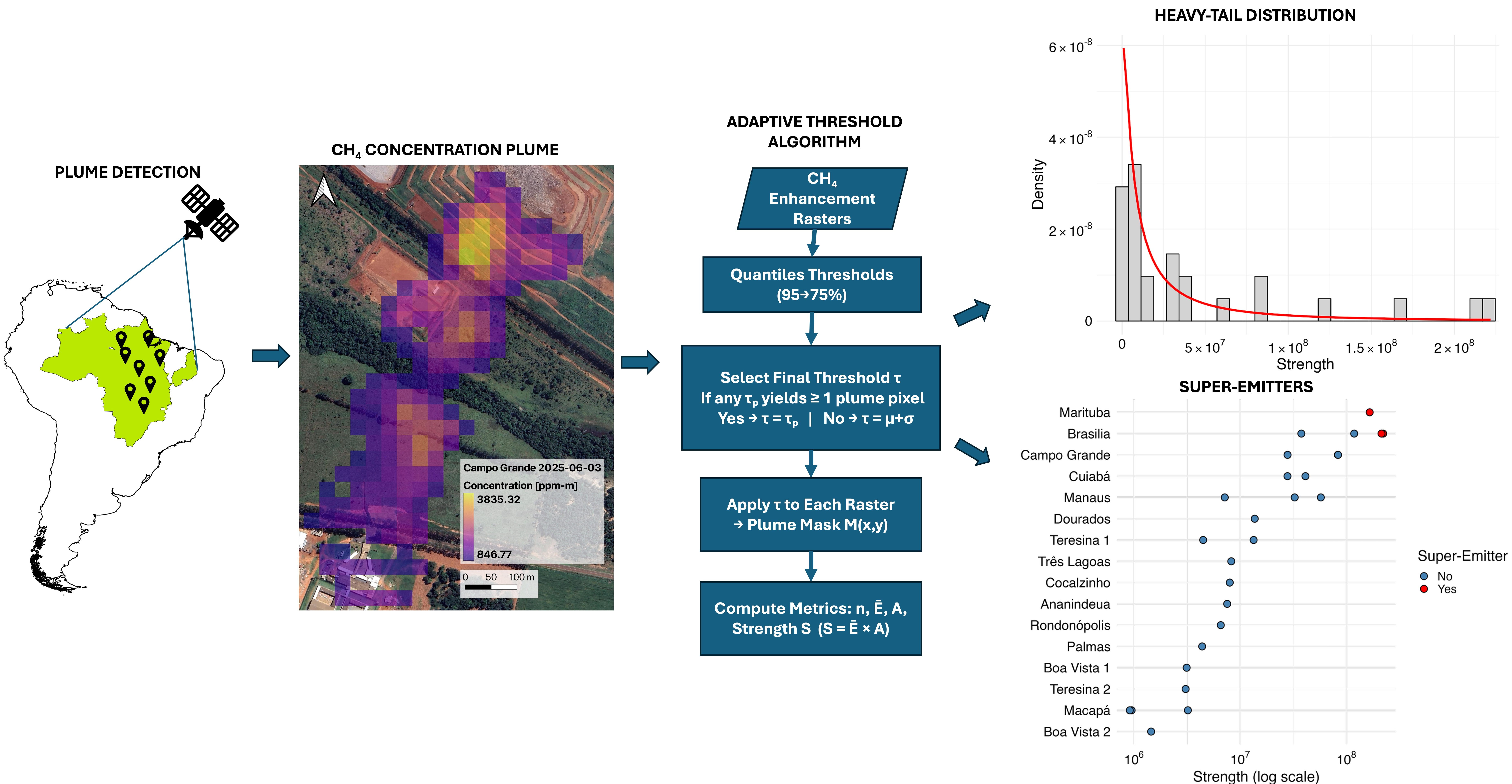 - Only three super-emitter events—two at Brasília and one at Marituba—dominated the regional CH4 budget, confirming a heavy-tailed, log-normal distribution of emissions.