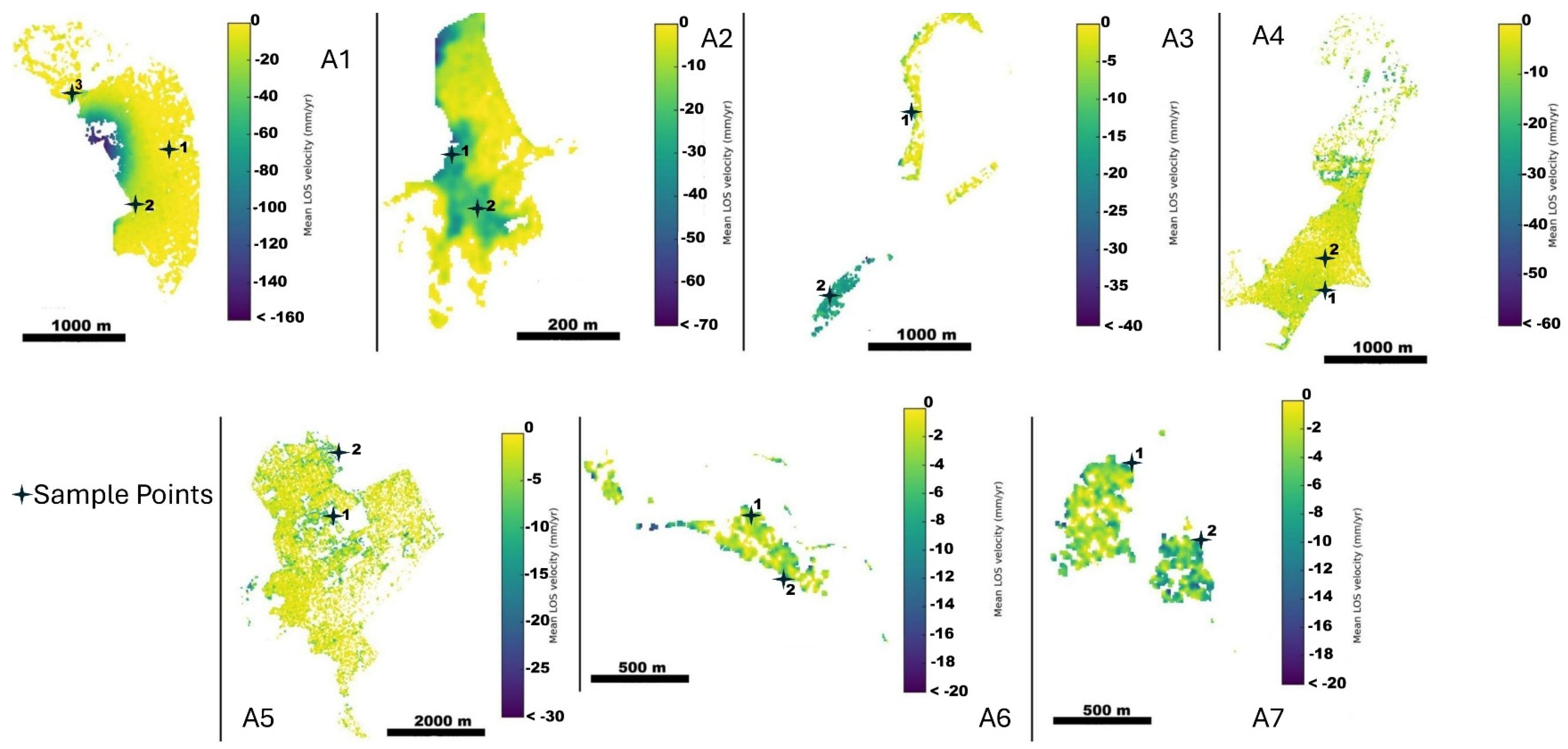 - Hasan, M.F.; Smith, R.; Vajedian, S.; Pommerenke, R.; Majumdar, S. Global land subsidence mapping reveals widespread loss of aquifer storage capacity. Nat. Commun. 2023, 14, 6180. [Google Scholar] [CrossRef]