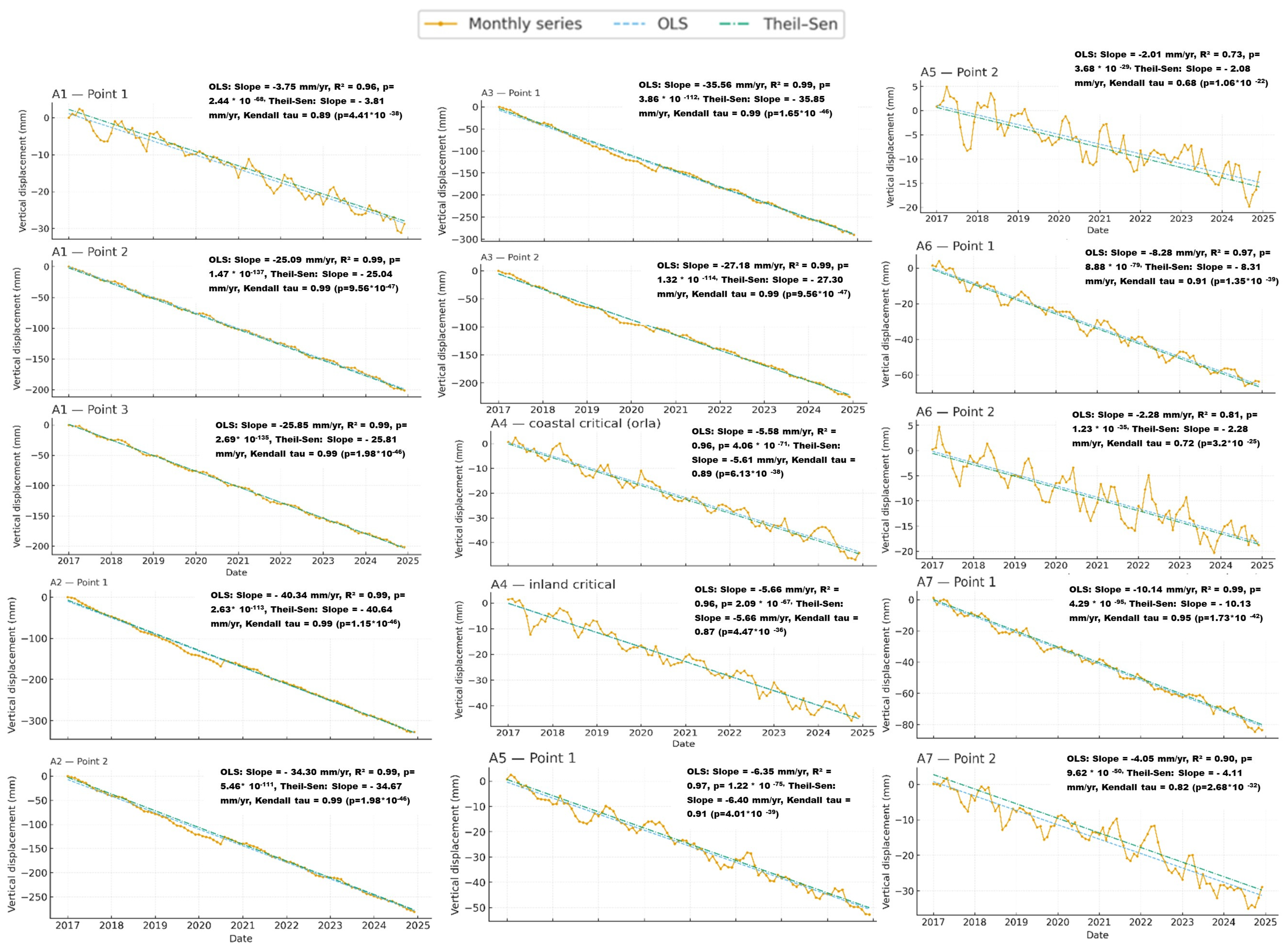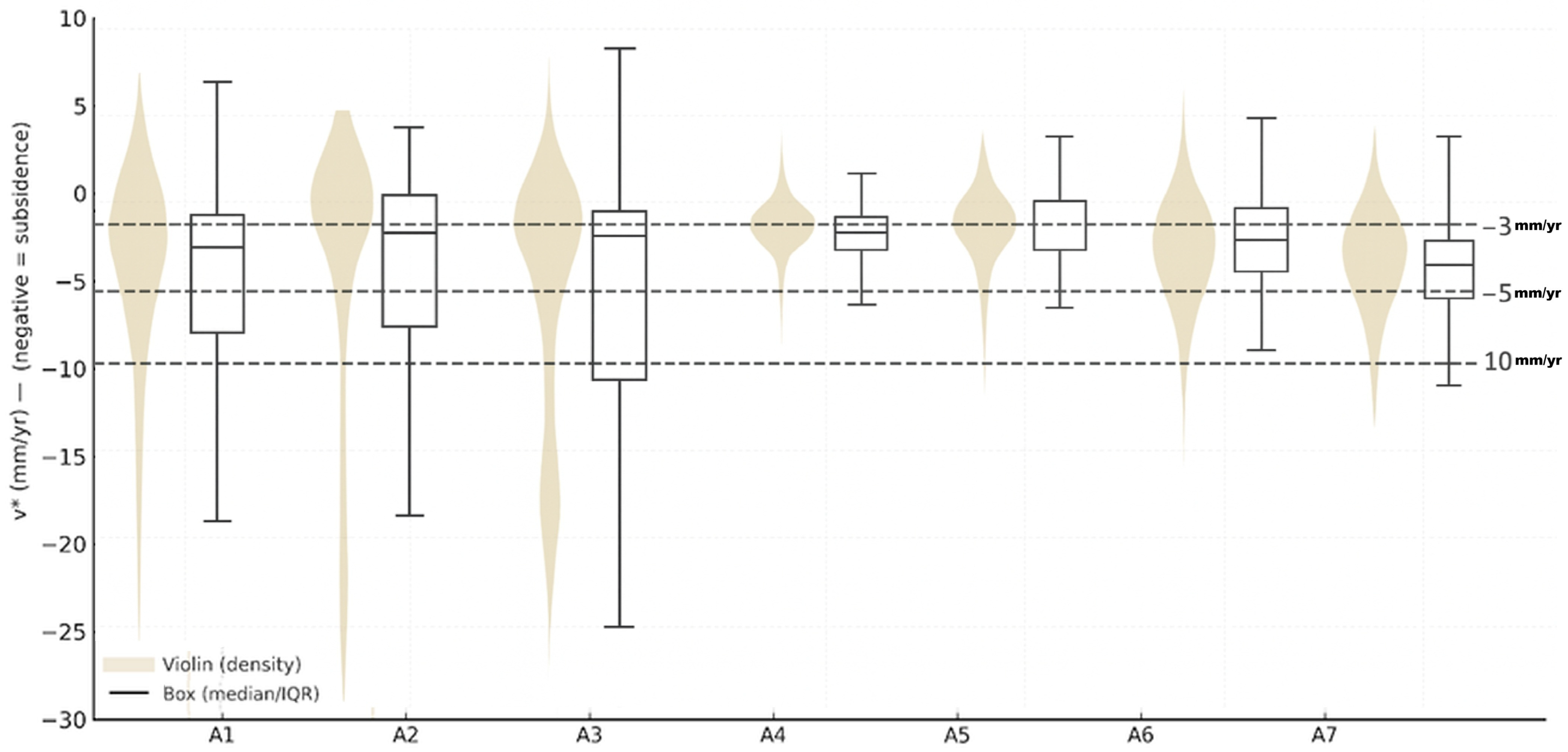 | S1/S5/S10 | Operational subsidence classes (−5 < v ≤ −1; −10 < v ≤ −5; v ≤ −10 mm·yr−1) |