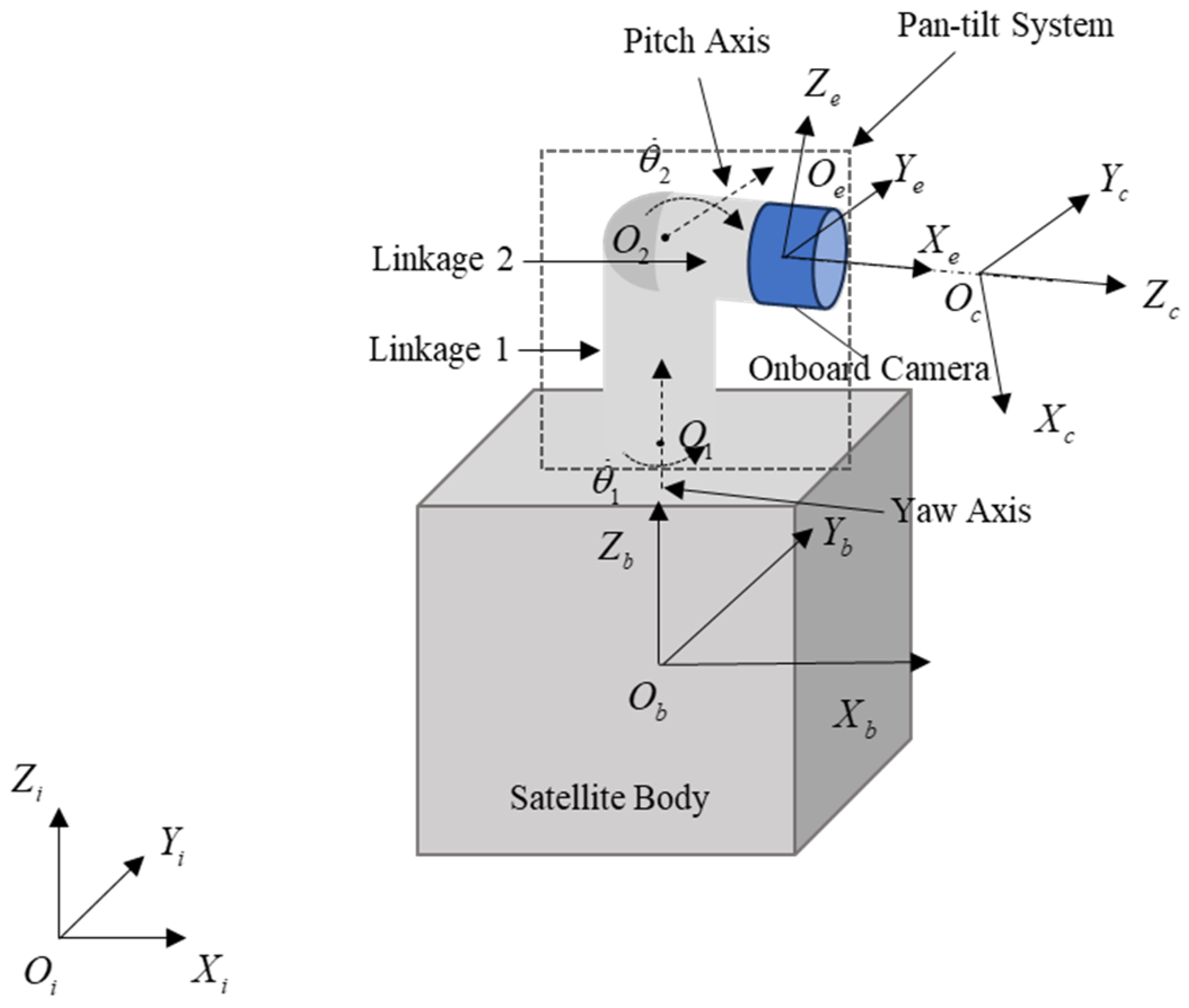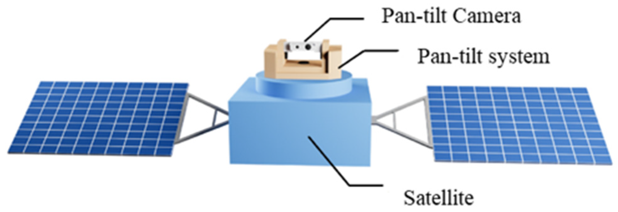 25]. In these studies, the error quaternion calculated from image coordinates is defined based on the deviation between the target’s real-time projection point coordinates and the desired projection coordinates on the image plane, and tracking instructions are designed based on the error quaternion. The effectiveness of these approaches relies heavily on precise onboard camera imaging models, which encompass both the internal optical parameters of the camera and its installation parameters relative to the satellite body. However, the in-orbit operational environment of video satellites—subject to thermal cycling, particle radiation, and micro-vibrations—can cause deviations in camera parameters. Since in-orbit calibration of camera parameters is often cumbersome and time-consuming, it significantly compromises the mission flexibility.