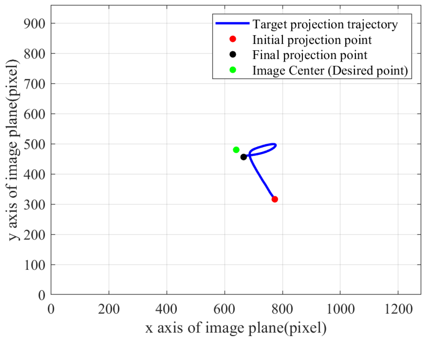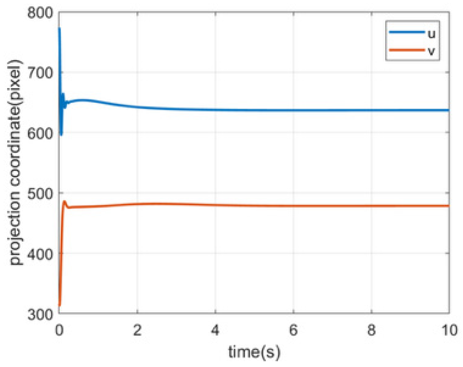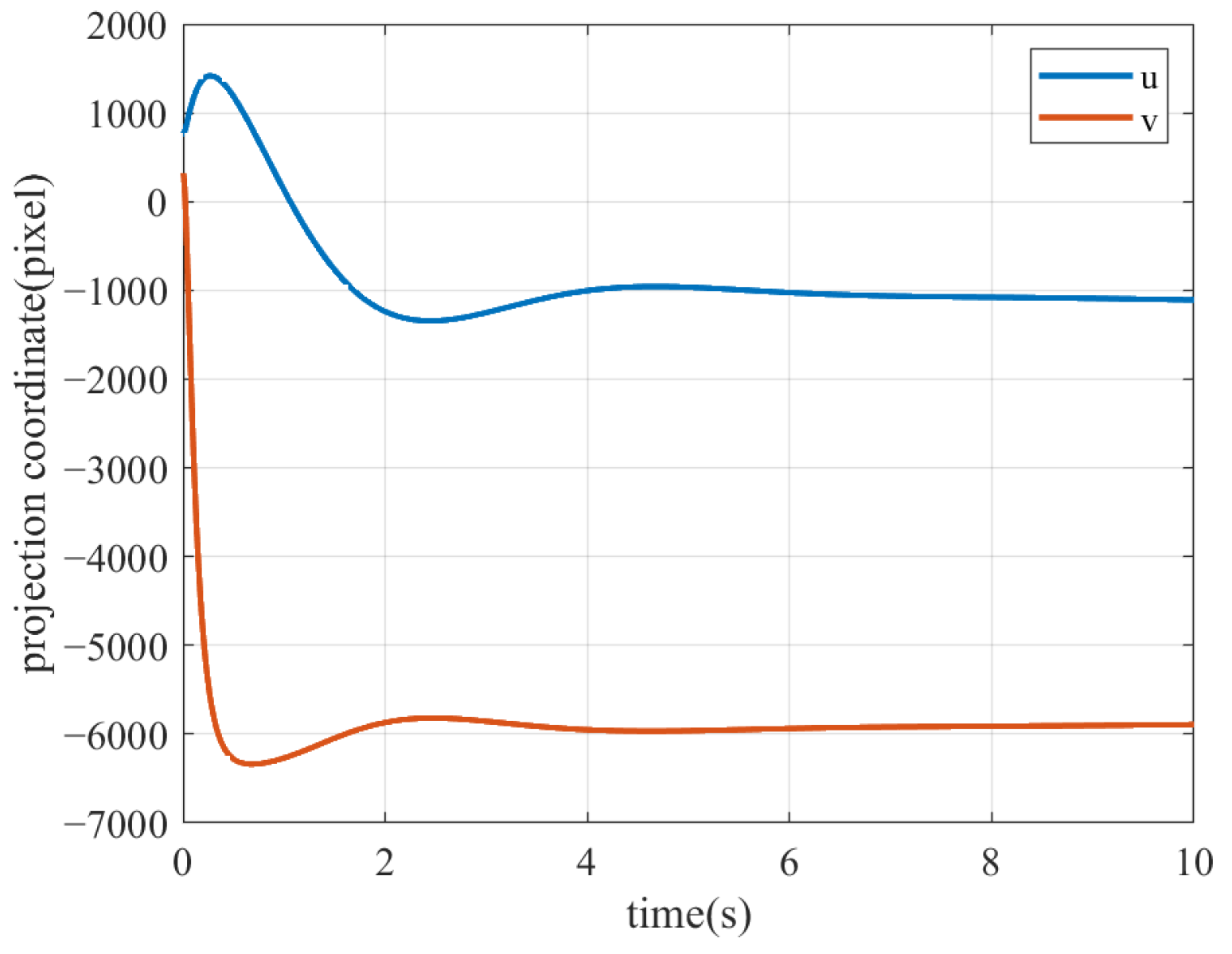 Figure 5, it can be seen that the onboard camera’s final pointing also reached a stable state, but the target projection gradually moves towards the edge of the image plane and eventually disappears from the camera’s field of view, resulting in target tracking failure.