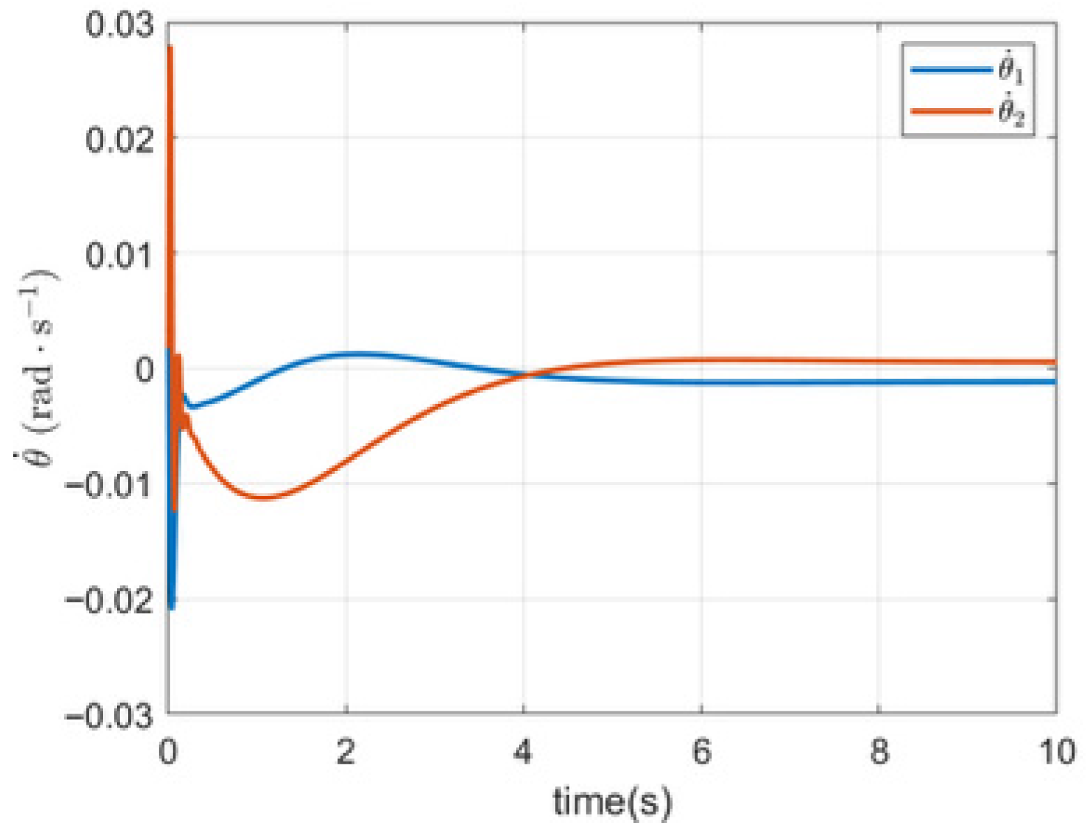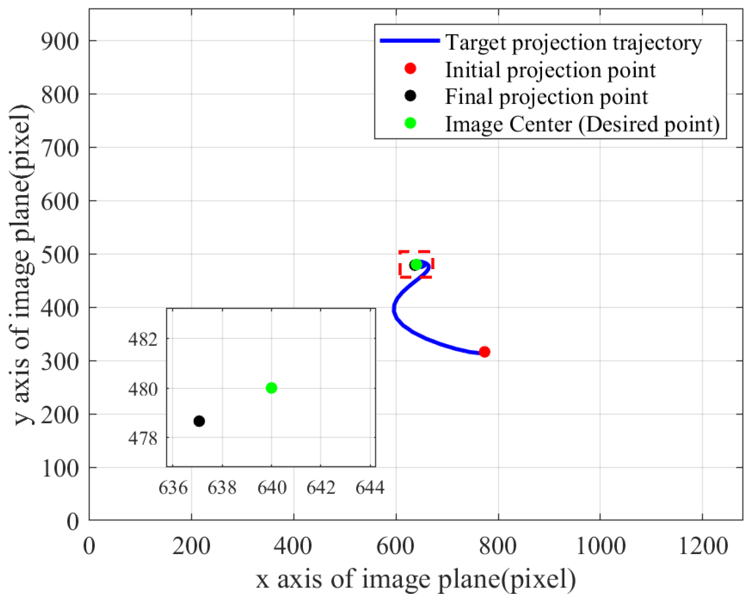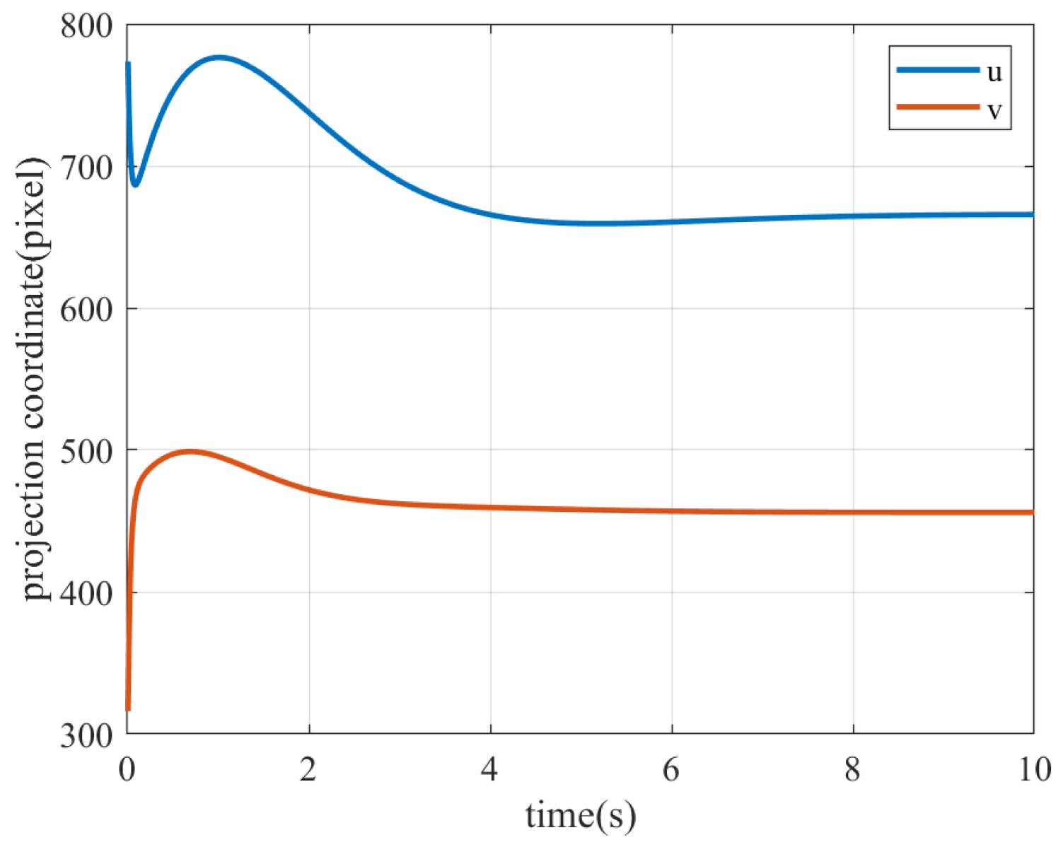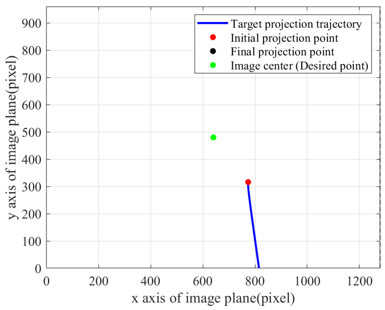 Figure 5, it can be seen that the onboard camera’s final pointing also reached a stable state, but the target projection gradually moves towards the edge of the image plane and eventually disappears from the camera’s field of view, resulting in target tracking failure.