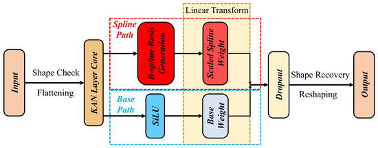 Currently, Kolmogorov–Arnold Networks (KANs), proposed by Liu et al. [20,39], offer a completely new approach to solving this fundamental problem. Inspired by the Kolmogorov–Arnold representation theorem, KANs fundamentally change the design paradigm of neural networks [20]. Unlike MLPs, which apply fixed activation functions on nodes (“neurons”), KANs apply learnable activation functions on edges (“weights”). These edge-based activation functions are parameterized as 1D splines (e.g., B-splines), allowing their shapes to be adaptively adjusted during training [40].