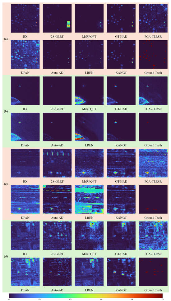 A comparative analysis of the two ablations reveals their distinct yet complementary strengths. The performance deficit from removing the KAN module is most acute in scenarios requiring sophisticated feature representation (e.g., Los Angeles-2 and ABU-Urban-4), affirming its role as a powerful feature extractor. Conversely, the performance penalty for removing the GCAT mechanism is severe in scenes with complex background clutter (e.g., Los Angeles-1 and Gulfport), highlighting its importance for adaptive spatial reasoning. In addition, the time efficiency analysis confirms that KANGT maintains a highly competitive inference speed (∼36 s) and the Auto-AD method typically requires about 30 s, while the LREN method can exceed 160 s for similar dataset sizes [52]. The proposed complete KANGT model, integrating both components, consistently achieves the highest or competitively high AUC scores across all datasets. It successfully bridges the gap between representational power and computational efficiency, delivering robust and practical anomaly detection performance.