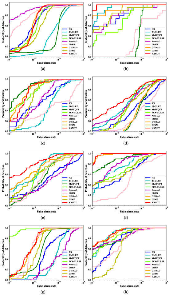 The cross-scenario generalization capability was assessed through a cross-dataset validation strategy, where the model was trained on one dataset and tested on another without any fine-tuning. The network’s layer channels depend on the bands in the input hyperspectral imaging data. Thus, the Los Angeles-1 and Los Angeles-2 datasets, possessing identical band counts, are the only two among the eight HSI collections appropriate for cross-validation studies. As summarized in Table 8, KANGT demonstrated strong transferability. When trained on Los Angeles-1 and tested on the unseen Los Angeles-2 dataset, it achieved a high AUC of 0.9666. Conversely, the model trained on Los Angeles-2 attained an AUC of 0.9472 on Los Angeles-1. These results confirm that the feature representations learned by KANGT possess strong robustness to geographical and contextual variations between different hyperspectral scenes.