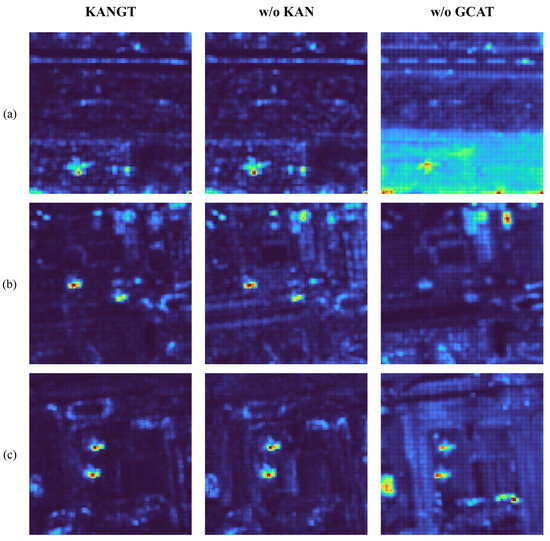 The removal of the KAN-MLP module led to performance degradation on most datasets, but exceptions such as Pavia and Cat Island had a relatively small impact, indicating that KAN-MLP had a negligible effect on near-perfect AUC scores. In the complex scenarios composed of backgrounds such as Los Angeles-1, Los Angeles-2, and ABU-Urban-4, the performance degradation was more obvious. The AUC scores of the latter two decreased by 0.0043 and 0.0024, respectively. The abnormal heatmaps in Figure 9 were analyzed. Compared with the KANGT model, the w/o KAN model has a weaker background suppression ability, resulting in a noisier background in the detection results. This discovery highlights the crucial role of the Kolmogorov–Arnold Network in the feature extraction process. Its superior function approximation capability enables the model to describe complex spectral–spatial relationships more accurately, thereby learning more discriminative features and enhancing the discrimination between anomalies and backgrounds, which is particularly important in challenging heterogeneous environments.