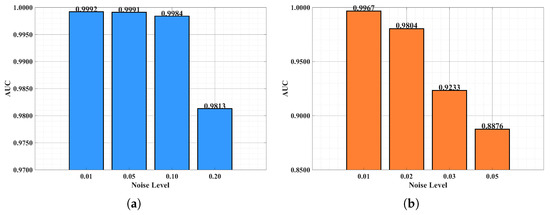 We further investigated the model’s robustness against two common types of noise: Gaussian noise [57] and salt-and-pepper noise [58]. The performance under varying noise levels is detailed in Table 9 and Figure 10. KANGT exhibited exceptional resilience to Gaussian noise. Even at a high noise level of 0.2, it maintained a commendable AUC of 0.9813, with only a minimal performance drop from 0.9992 (at level 0.01). For salt-and-pepper noise, the model showed strong resistance to low-level corruption (AUC = 0.9967 at level 0.01). Although performance decreased more noticeably at higher noise intensities, this is consistent with the destructive nature of salt-and-pepper noise, which randomly corrupts individual pixels. The model’s superior performance, especially under Gaussian noise, underscores its suitability for practical applications where such perturbations are common.
