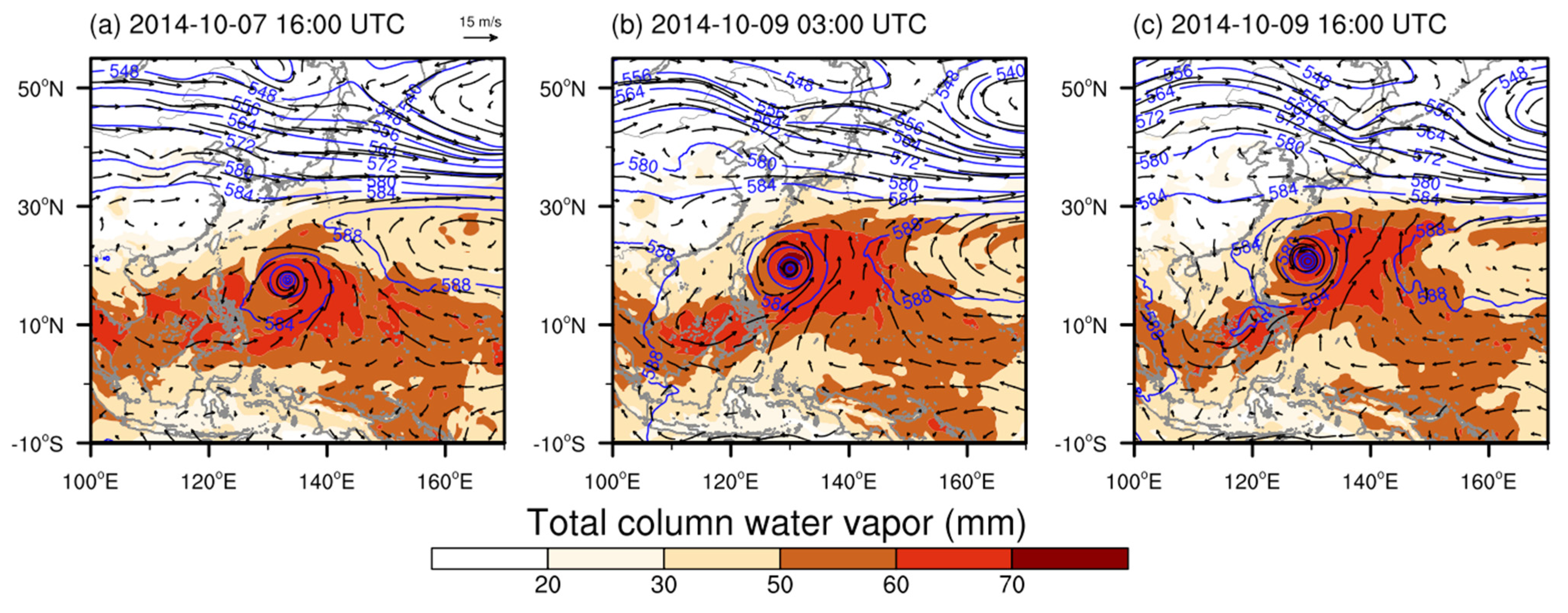 - The sudden turn of Super Typhoon Vongfong (2014) occurred during the eastward retreat of the WPSH. Before the sharp turn, the typhoon reached its peak intensity with the lowest central pressure and the highest wind speed. Its structure was highly organized with strong and concentrated upward motion within the eyewall. During the sharp turn, the typhoon weakened, the upward motion in the eyewall decreased, and the TC structure became more dispersed.