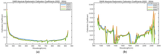 The radiometric response of the HSI sensor exhibits gradual degradation as a result of combined influences such as space radiation exposure, component aging, and mechanical vibration. Although the onboard calibration system provides basic spectral calibration capability, it is unable to capture short-term or rapid variations in radiometric response, and the low temporal frequency of site calibration campaigns further limits the ability to monitor real-time changes in sensor performance. A statistical analysis of the site calibration coefficients obtained [6] for HJ-2A/HSI from 2022 to 2024 confirms these limitations, as different degrees of radiometric degradation were observed across spectral bands, indicating clear temporal variations in the sensor’s on-orbit behavior. The temporal trends for the VNIR and SWIR bands are shown in Figure 2.