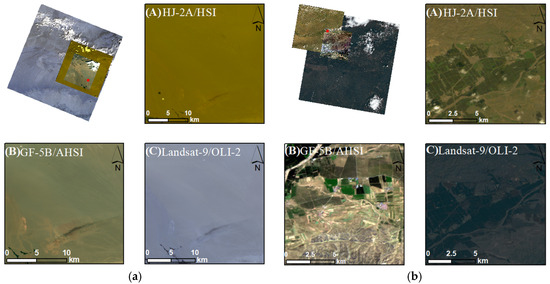 Validation image pairs: (a) Dunhuang site, (A) HJ-2A/HSI image, (B) GF-5B/AHSI image, (C) Landsat-9/OLI-2 image; (b) Vegetation site, (A) HJ-2A/HSI image, (B) GF-5B/AHSI image, (C) Landsat-9/OLI-2 image.