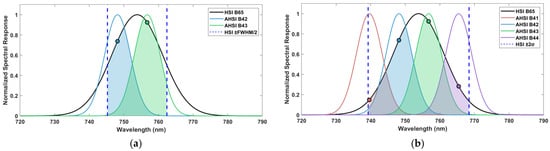Spectral HJ-2A/HSI with ZY1-02D/AHSI spectral channel matching at two characteristic integration ranges using the VNIR-65 Band: (a) Spectral channel matching [FWHM]; (b) Spectral channel matching [4σ].