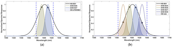 Spectral HJ-2A/HSI with ZY1-02D/AHSI spectral channel matching at two characteristic integration ranges using the SWIR-51 Band: (a) Spectral channel matching [FWHM]; (b) Spectral channel matching [4σ].