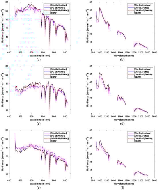Across the three calibration sites in both VNIR and SWIR spectral ranges, the DG-SBAF(4σ) method demonstrated superior radiometric consistency. In the VNIR range, mean relative deviations were 4.68%, 7.70%, and 6.99% at Dunhuang, Baotou, and Tak, respectively, outperforming DG-SBAF(FWHM) (4.89%, 8.12%, 7.57%) and the traditional SBAF method (5.33%, 8.74%, 7.99%). Similarly, in the SWIR range, DG-SBAF(4σ) achieved deviations of 7.75%, 9.79%, and 8.48%, compared to 8.08%, 10.14%, 9.02% for DG-SBAF(FWHM) and 8.40%, 10.46%, 9.62% for traditional SBAF. The overall mean RD across all sites was lowest for DG-SBAF(4σ): 6.46% (VNIR) and 8.67% (SWIR) versus 6.86%/9.08% (DG-SBAF(FWHM)) and 7.35%/9.49% (traditional SBAF).