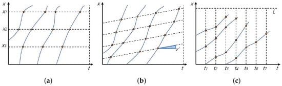 In Figure 2, the horizontal axis (x) represents the observation point along the road, and the vertical axis (t) indicates time. Each yellow dot denotes the position of a vehicle observed at a given time step. Figure 2a depicts fixed-point observation at the roadside, where the observation position (x) is constant while time progresses vertically. Figure 2b shows mobile observation within the traffic stream, where both the observation position and time progress together. Figure 2c illustrates aerial observation from above, where observations cover multiple positions simultaneously as time advances. These conceptual diagrams describe how traffic phenomena can be monitored from different spatial and temporal perspectives.