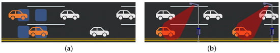 This paper proposes a next-generation sensing framework called the Moving Detection System (MDS), designed to overcome the inherent limitations of conventional traffic detection methods. Figure 3 illustrates traditional point-and-section detection systems. In Figure 3a, the blue boxes represent conventional point detectors embedded in the road surface, which record vehicle passage at fixed locations. These detectors provide localized traffic information, such as vehicle count or occupancy, at specific points. However, because they measure traffic only when a vehicle passes directly over the sensor, they are limited in capturing continuous flow dynamics or vehicle interactions between detection points. Figure 3a depicts conventional point detection, while Figure 3b represents section detection systems. Although these methods are effective for analyzing traffic flow in localized segments, they struggle to accurately assess extended road sections influenced by geometric variables, such as on- and off-ramps.