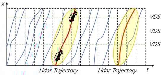 As depicted in Figure 5, the MDS approach combines the strengths of segment detection for analyzing traffic flow and section start and end points with those of aerial-based detection, enabling continuous density estimation and localized congestion recognition. In this conceptual illustration, the blue lines represent vehicle trajectories, while the red line denotes the Ego vehicle’s path equipped with a LiDAR sensor.(Pandar128, Hesai Technology, Shanghai, China). The yellow ellipses indicate the dynamic LiDAR detection zones, showing how the proposed system continuously captures vehicle motion and density information across lanes. By integrating these multi-perspective observations, MDS enables seamless spatiotemporal monitoring of traffic states along complex road geometries. One of the key advantages of the MDS method is its capability to assess variations in traffic states according to time, lane configuration, and geometric complexity. This enables detailed monitoring of lane-level traffic dynamics, an essential factor for advanced safety diagnosis and adaptive traffic management. A detailed methodological description and experimental implementation of the proposed MDS are presented in the subsequent sections.