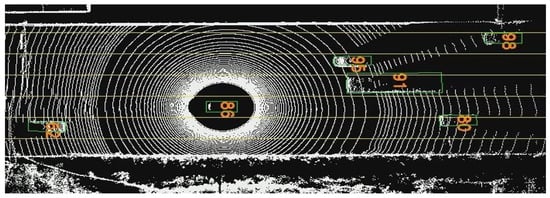 Detected results allow for the simultaneous acquisition of vehicle height and length data for vehicles moving around the Ego vehicle. This data, difficult to collect with traditional sensors, serves as foundational material for future density and safety evaluations. Three-dimensional LiDAR data is utilized for deep learning-based object detection. After detecting objects with LiDAR sensors, the process does not use the z-value of the PCD to optimize computation, converting it into a two-dimensional BEV map. This conversion from the world coordinate system to the commonly used two-dimensional xy coordinates is primarily for the efficient use of large volumes of 3D big data in real-time operations. Reducing the data to two dimensions decreases computational load, enhancing process efficiency and enabling intuitive visualization in an analyzable 2D map format. This visualization aids intuitive understanding of the progression and appropriateness of operations, enabling direct analysis of road conditions. The system maps lane information for traffic analysis by lane, using GPS data to capture the road’s lane layout. It employs a LiDAR-based lane recognition method for mapping lane information. LiDAR sensors can identify reflectivity, enabling the extraction of lane features. To determine the lane-marking distribution used for lane-level traffic analysis, this study adopts a hybrid method that combines GPS-referenced lane geometry with LiDAR-based lane detection. Lane-marking features were extracted from the LiDAR point cloud using an intensity-based filtering and clustering approach, following the lane detection methodology proposed by Choi et al. [41]. This method enables reliable identification of lane markings even under partial occlusions or lane-wear conditions. The LiDAR-derived lane features were then aligned with GPS-based road geometry to construct a stable lane-distribution map, which forms the basis of the lane boundaries used in the analysis.