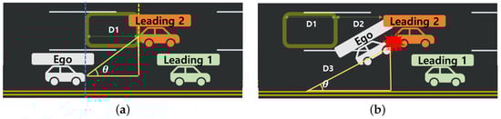 Figure 9 illustrates the process of determining collision presence based on lane-changing (evasive steering) actions. In this system, the potential for collision avoidance is assessed by calculating collision presence, thereby identifying safe spaces for evasion. Figure 9a depicts the initial moment, while Figure 9b showcases the anticipated moment of collision. represents the vehicle ahead in the target lane (Leading 2), is the distance between the Ego vehicle and the vehicle ahead in the target lane (), is the distance traveled by within a time interval of t seconds, and is the distance traveled by the Ego vehicle within the same time interval. The term represents the horizontal distance between the Ego vehicle and following the lane change. For a collision to occur (as shown in case Figure 9b), the condition must be met. Consequently, the equations for assessing the availability of safe spaces in all directions are given in Equations (5)–(8).