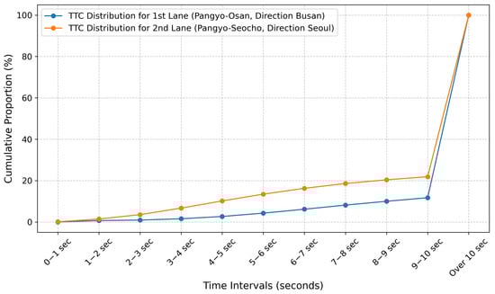 From a methodological standpoint, we first established an appropriate TTC-based surrogate safety threshold for Korean highway environments. By comparing prior work by Oh et al. [46] with MTTC distributions derived from field data on the Pangyo–Osan and Pangyo–Seocho sections (Figure 11, Figure 12 and Figure 13, Table 3 and Table 4), we verified that a 3 s threshold is both empirically reasonable and sensitive to changes in operational risk. MTTC values below this threshold were defined as HMTTC and adopted as the core surrogate safety indicator in the proposed framework.