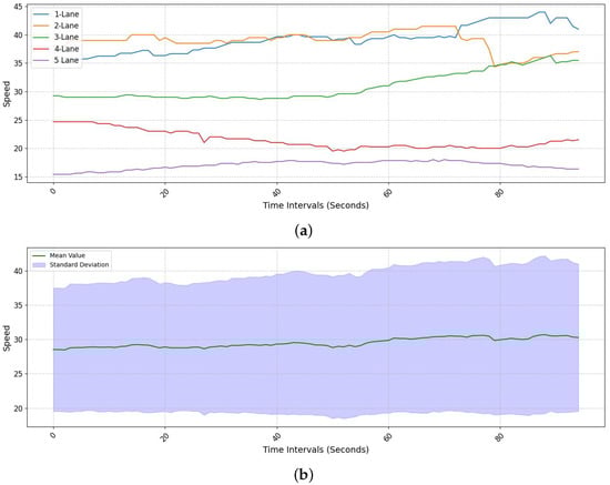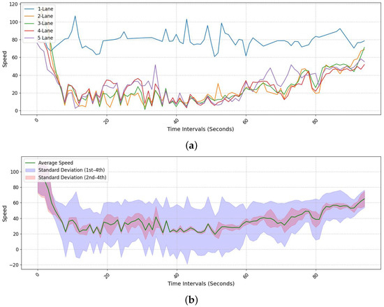 LiDAR speed graph for all lanes (Pangyo to Banpo). (a) Lane-specific speeds computed from LiDAR measurements, showing variations in speed profiles across lanes. (b) Overall average speed with standard deviation bands, illustrating how lane-to-lane variability influences aggregated traffic conditions.