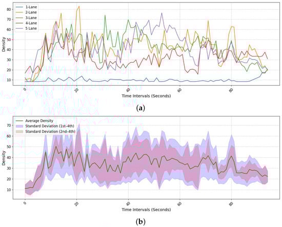 Density variation graph by lane (Pangyo to Osan). (a) Density changes for lanes 1 through 5, illustrating distinct congestion patterns across individual lanes. (b) Overall average density with standard deviation bands, showing how variability among lanes influences the aggregated density profile.