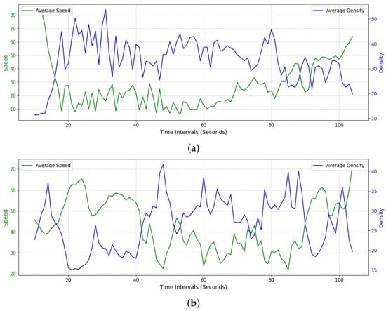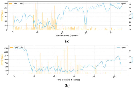 The following Figure 17 compares traffic conditions between two regions using lane density and LiDAR-derived speed. In this experiment, density denotes the lane length occupied by vehicles within a 50 m window, and speed denotes the lane-average speed. Density values are plotted in blue, and LiDAR speeds in green. Figure 17a shows the segment from Pangyo IC to Osan IC, and Figure 17b from Pangyo IC to Banpo IC. Both plots visibly exhibit an inverse relationship between density and speed, consistent with the fundamental expectation that higher lane occupancy yields lower individual vehicle speeds. This visual experiment demonstrates the qualitative correlation between lane density and speed. To complement this visual evidence, subsequent experiments perform a quantitative correlation analysis between HMTTC occurrences and lane-level speed/density, thereby substantiating the proposed framework’s ability to capture congestion-related safety risk. Therefore, the method proposed in this paper can effectively analyze lane-by-lane traffic conditions.