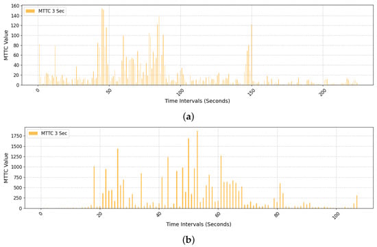 Hayward et al. [18] were pioneers in introducing the concept of Time to Collision (TTC), initially proposed as a tool to measure the severity of traffic collisions. TTC indicates the time remaining until a collision if two vehicles continue on their current paths and speeds. In practice, a predicted collision time shorter than a set threshold between two converging vehicles indicates an imminent collision [18]. The computation of TTC is straightforward and can be derived using the formula in Equation (1), where and denote the positional coordinates of two consecutive vehicles, and represent their velocities, and is the length of the leading vehicle. Due to its comprehensiveness and other advantages, TTC has become the most frequently used surrogate safety measure and is a standard reference in numerous studies and documents, including the final report of SSAM.