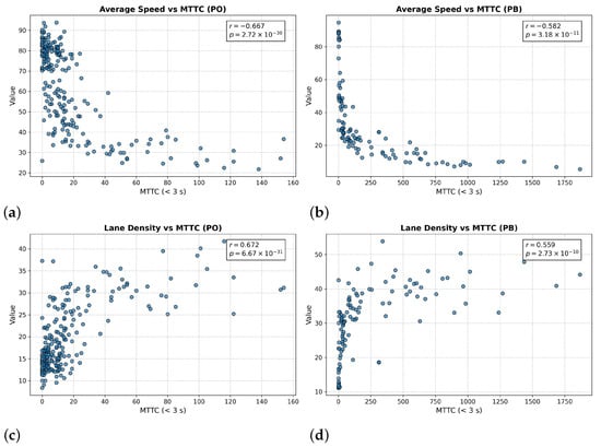 Across all comparisons, the p-values are far below 0.05, indicating statistically significant correlations. The correlation magnitudes are in the moderate range, and the signs are consistent with the expected relationships. Figure 21a,b visualize the Pearson relationships corresponding to Figure 19a,b and Figure 21c,d correspond to Figure 20a,b. As summarized in Table 5, both positive and negative associations are evident. These results confirm that HMTTC is systematically related to speed and density, supporting its use as a congestion-sensitive surrogate safety indicator. These findings provide a quantitative foundation for the interpretation and broader implications discussed in the following section.
