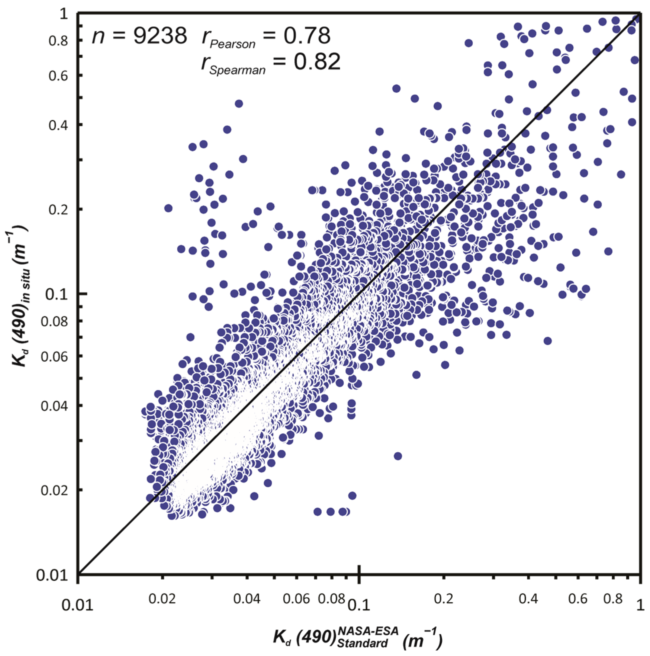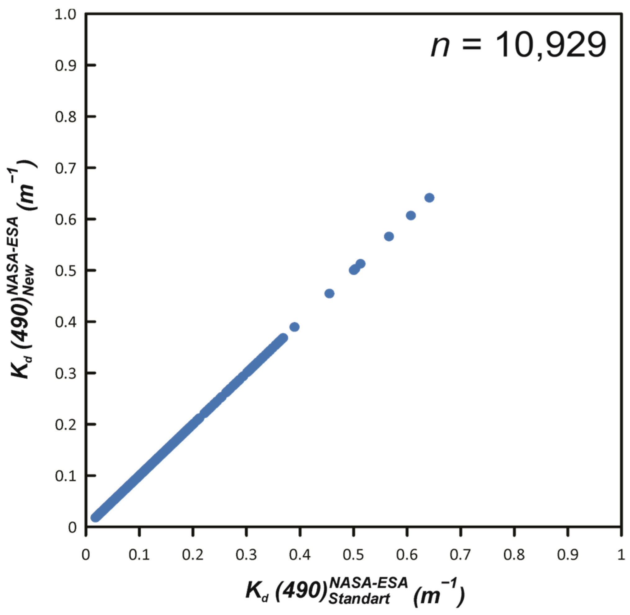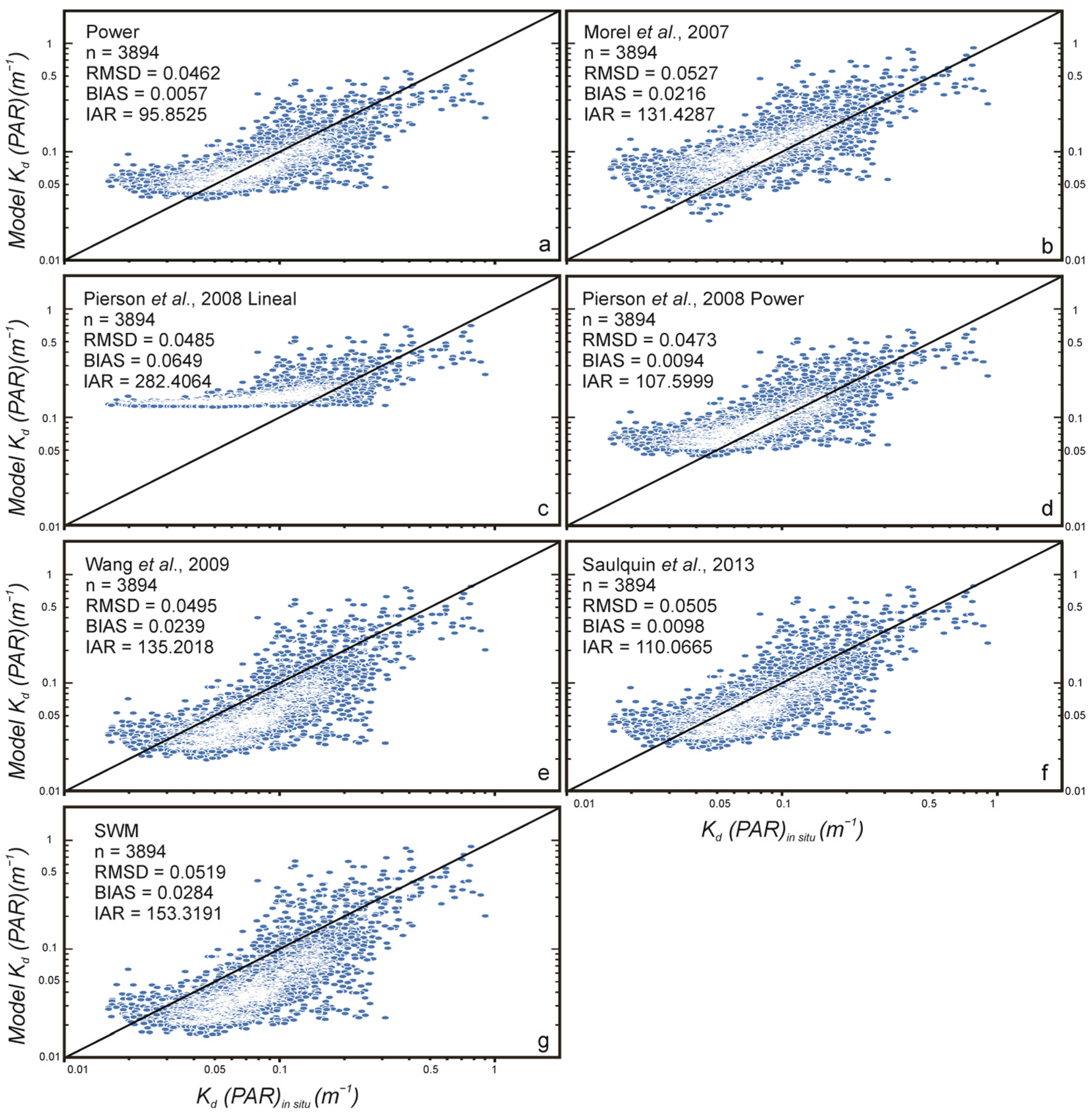 - Begouen-Demeaux, C.; Boss, E.; Tan, J.; Frouin, R. Algorithms to Retrieve the Spectral Diffuse Attenuation Coefficient of Light in the Ocean from Remote Sensing. Opt. Express 2024, 32, 2507–2526. [Google Scholar] [CrossRef]