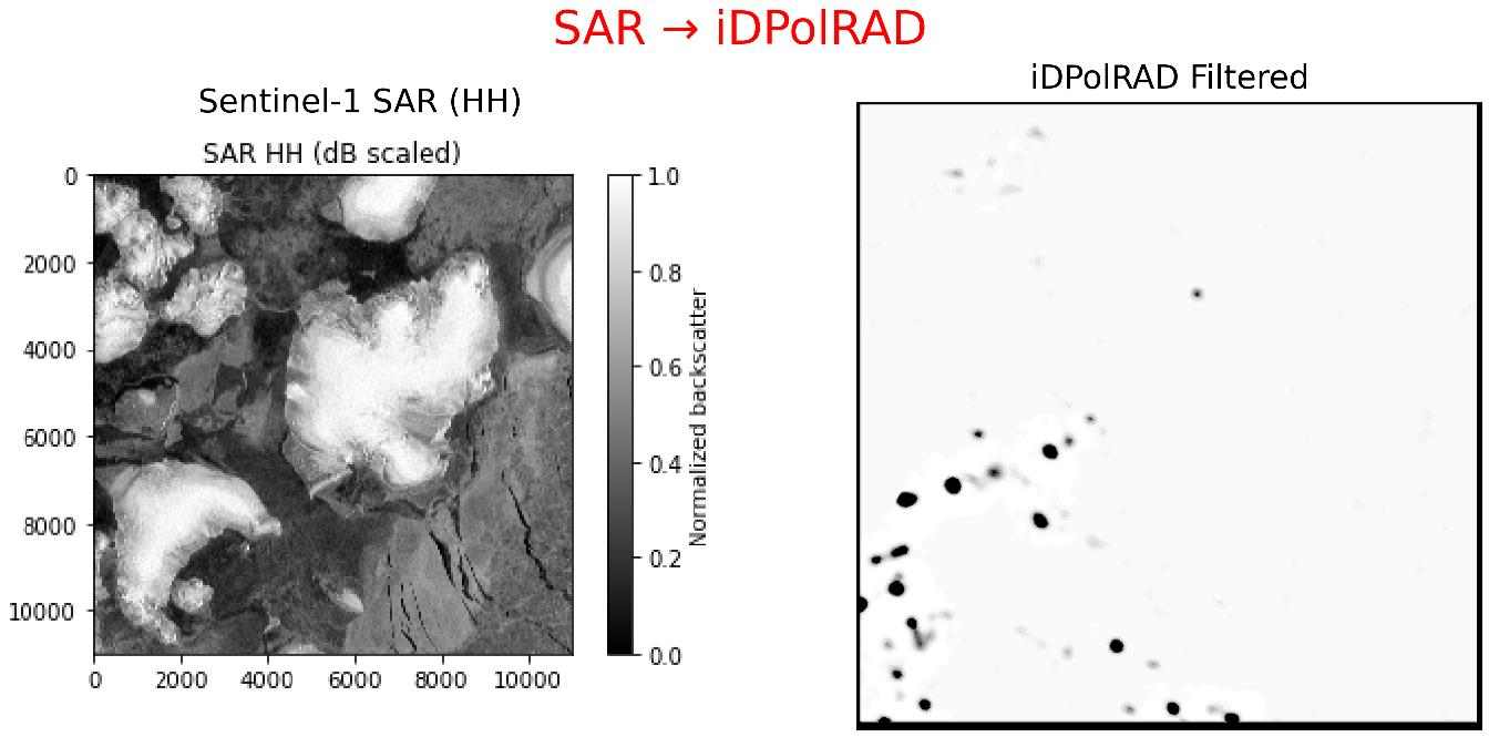 19]. The iDPolRAD algorithm leverages dual-polarisation Sentinel-1 Extra Wide Swath (EWS) imagery to enhance iceberg contrast by filtering and combining co-polarised (HH/VV) and cross-polarised (HV/VH) intensity images.