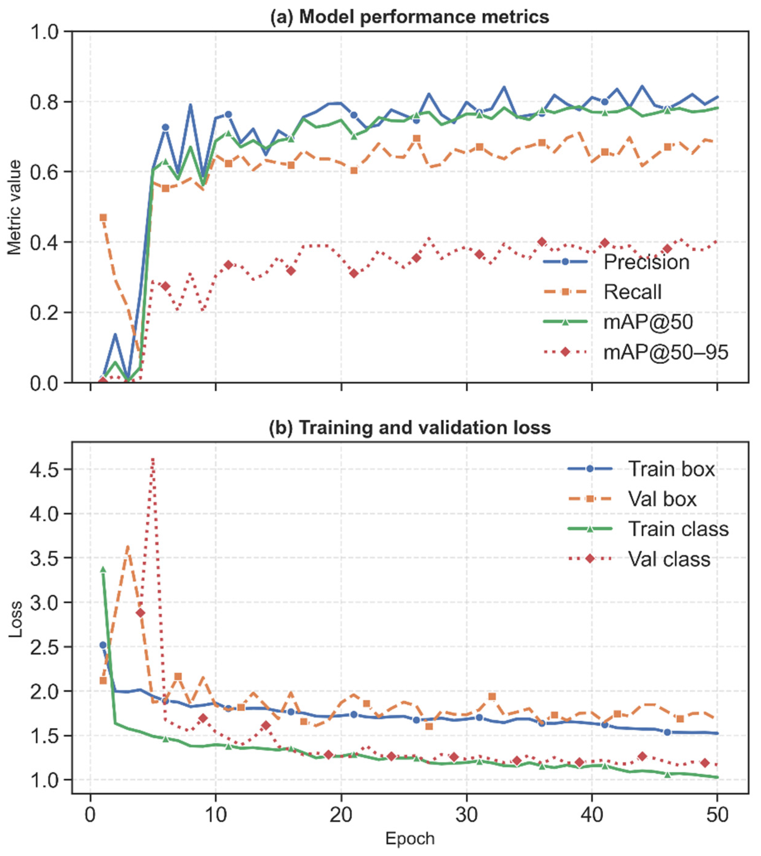 Figure 4 are computed using standard AP measures rather than generalised intersection over union (GIoU). YOLOv8 model training metrics are reported in