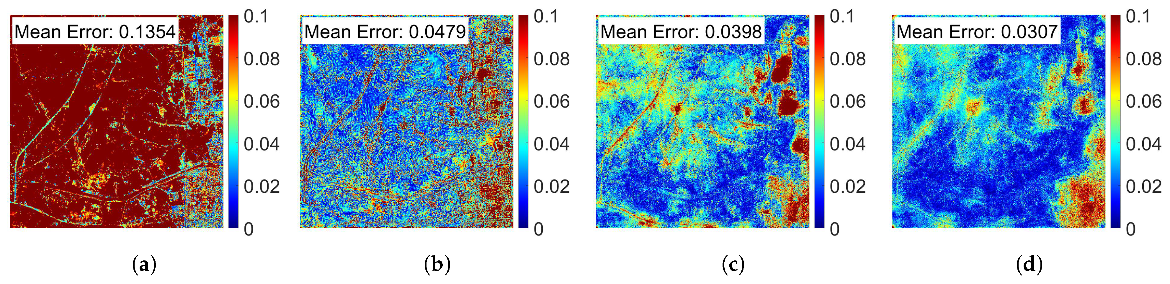 Figure 6 shows the pixel-wise mean absolute error (MAE) between different methods and the ground truth. The error maps clearly show that our method achieves the lowest reconstruction error. This is visible from the dominant blue colors in subfigure (d), which represent small errors. In comparison, CloudGAN (b) and PM-LSMN (c) show more warm-colored areas. These warm colors mean larger errors remain. The input image (a) has the highest errors, especially where clouds are present. These visual comparisons confirm that our approach better preserves original scene details while effectively eliminating cloud interference.