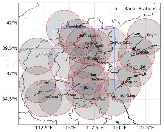 S-band dual-polarization radar distribution and observation coverage diagram. The blue box indicates the experimental area, and the gray shading represents the radar observation coverage area, and the red circles denote the detection boundary of each radar station.