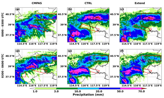 3-h accumulated precipitation distributions on 30 July 2023: CMPAS observations (left column), CTRL experiment (middle column), and Extend experiment (right column) for 00:00–03:00 UTC (top row) and 03:00–06:00 UTC (bottom row). (a) CMPAS 00:00 UTC–03:00 UTC; (b) CTRL 00:00 UTC–03:00 UTC; (c) Extend 00:00 UTC–03:00 UTC; (d) CMPAS 03:00 UTC–06:00 UTC; (e) CTRL 03:00 UTC–06:00 UTC; (f) Extend 03:00 UTC–06:00 UTC. The three red rectangles correspond to the three key regions in Figure 2.