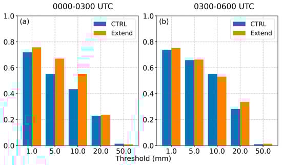 TS for 3-h accumulated precipitation forecasts from the comparison experiments between CTRL and Extend: (a) 0–3 h forecast lead time; (b) 3–6 h forecast lead time. The x-axis represents the precipitation threshold (mm), and the y-axis represents the TS score.