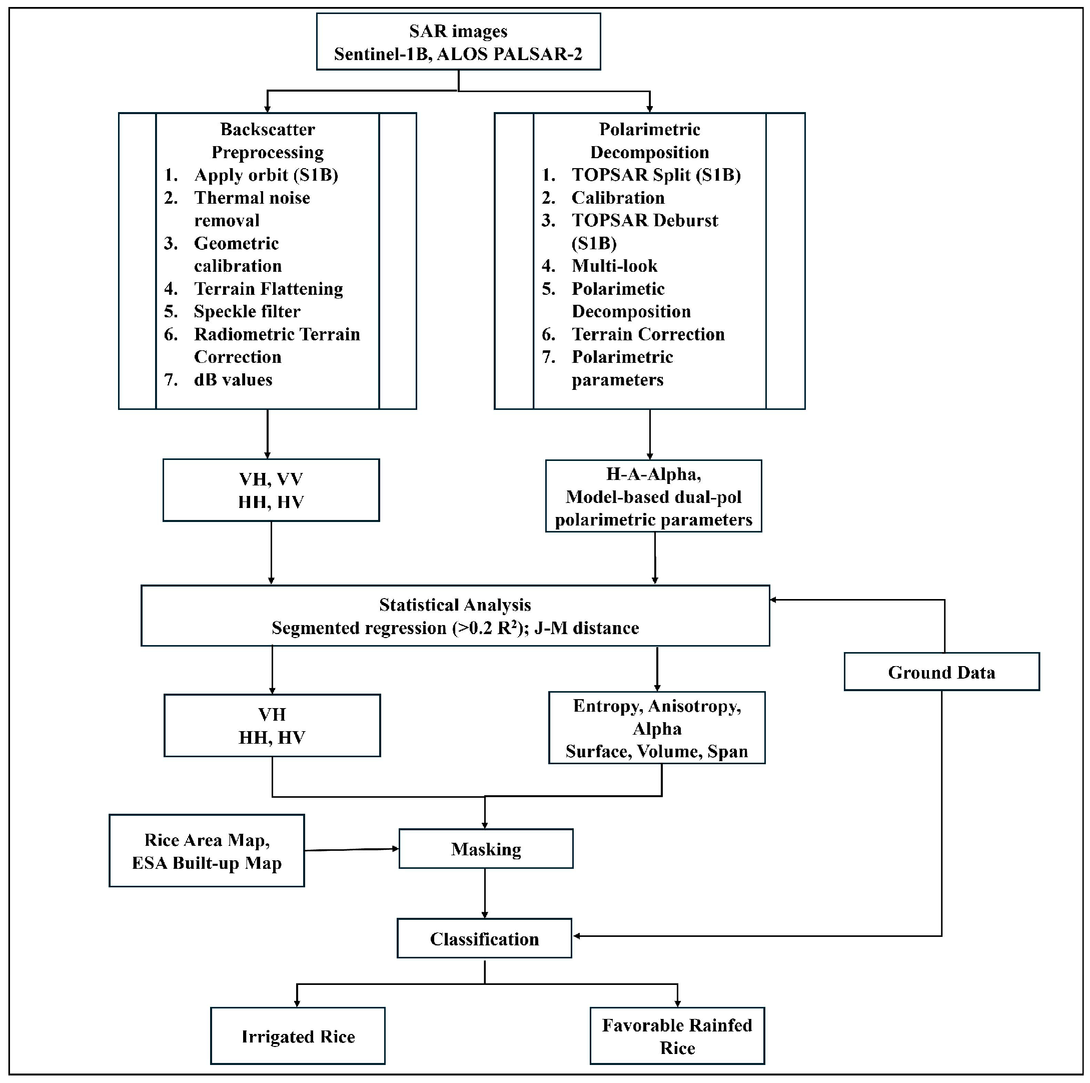 21], to discriminate between irrigated and rainfed rice. Phenology-based and temporal vegetation indices have proven to be useful tools for distinguishing rice ecosystems; however, persistent cloud cover during the monsoon season hinders accurate delineation. The use of multi-temporal and different polarization SAR images has improved the detection of rainfed rice, particularly under waterlogged conditions [