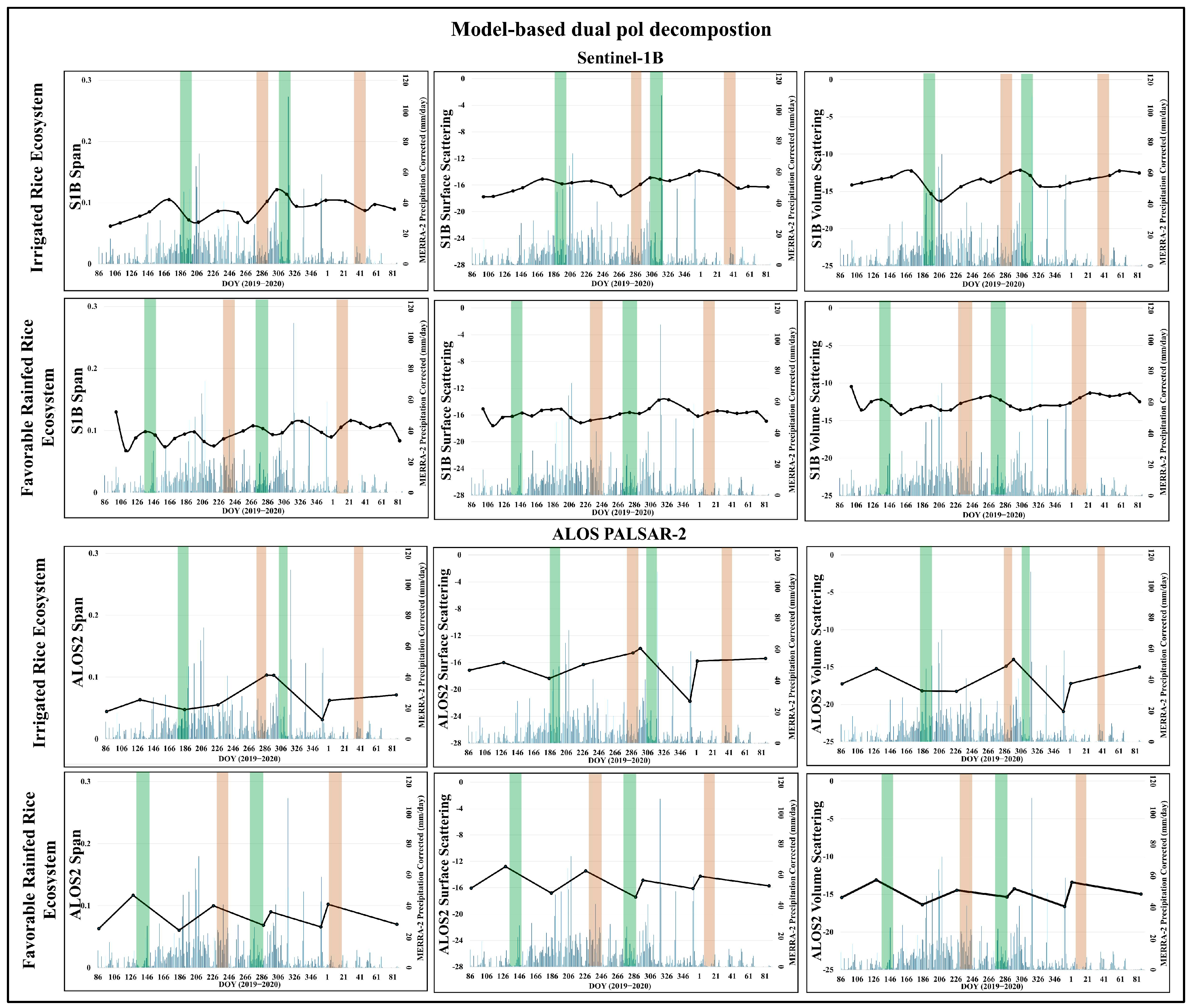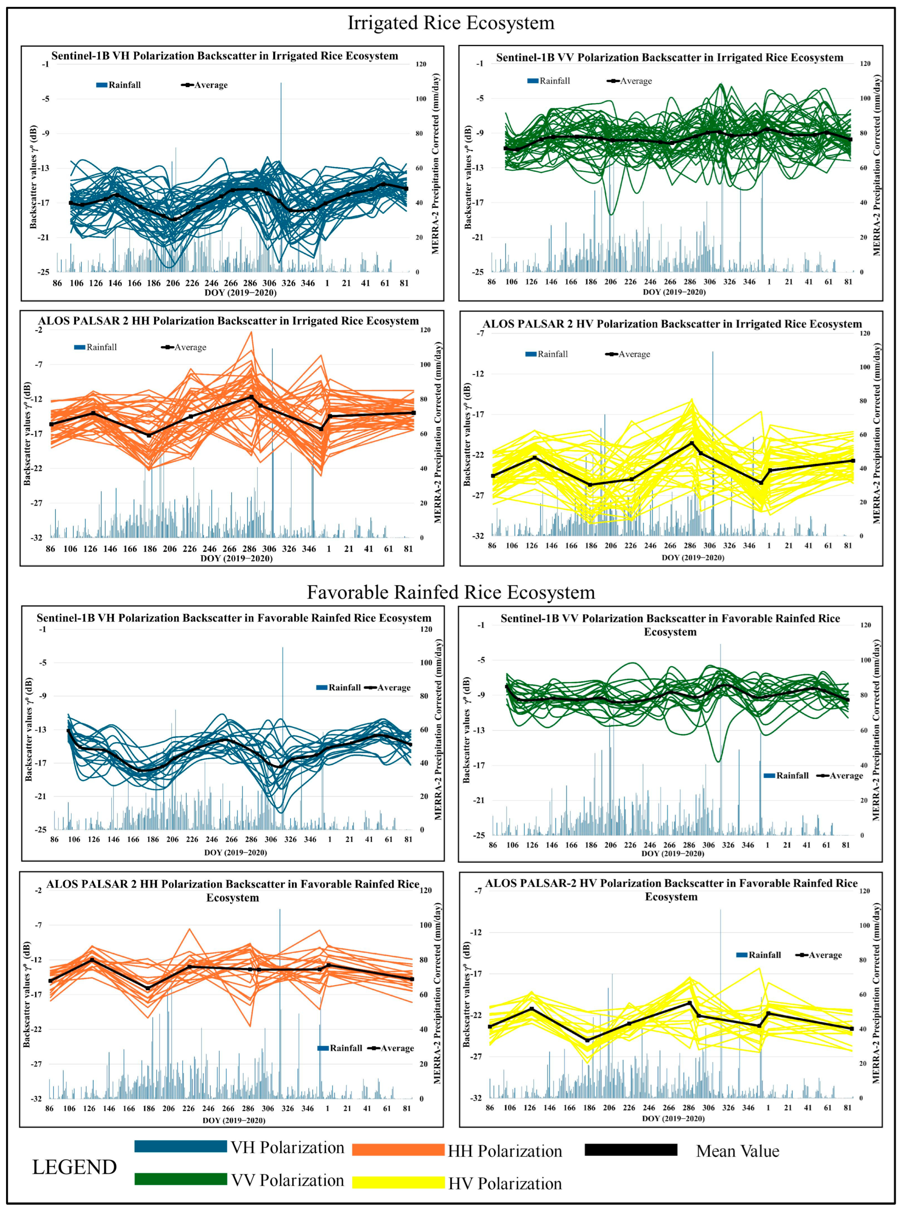 51]. Same as surface scattering, both irrigated and favorable rainfed rice ecosystems show peaks in scattering following rainfall events, especially in favorable rainfed rice fields.