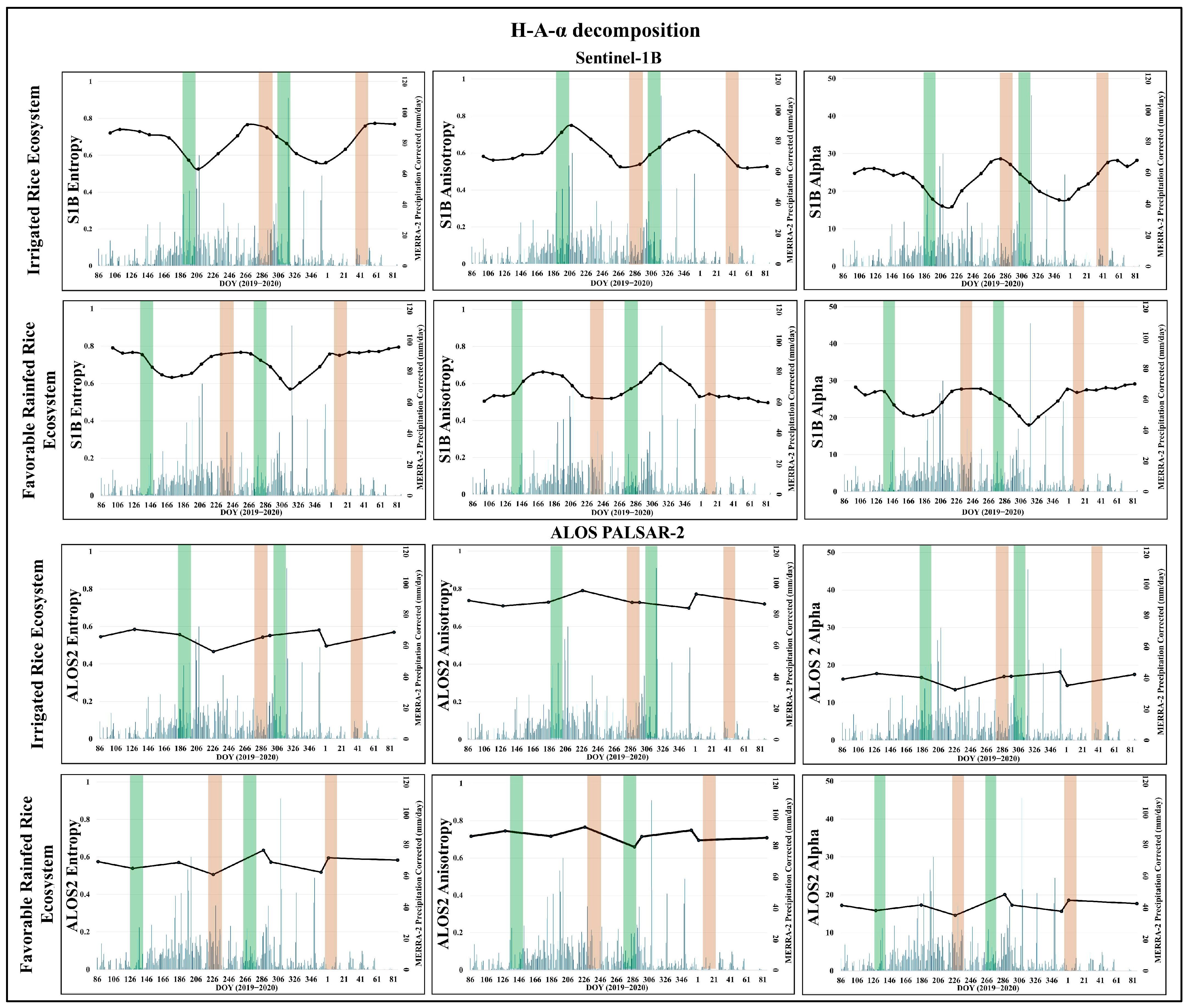 34]. It has considerable potential for yield improvement when supported by appropriate monitoring and management interventions. Discriminating these systems through SAR polarimetry can, therefore, provide valuable insights for targeted interventions, risk reduction, and climate adaptation strategies. With the different SAR sensors’ (Sentinel-1B and ALOS PALSAR-2) penetration ability and response, the polarimetric parameters may offer different perceptions for characterizing irrigated and favorable rainfed rice ecosystems.