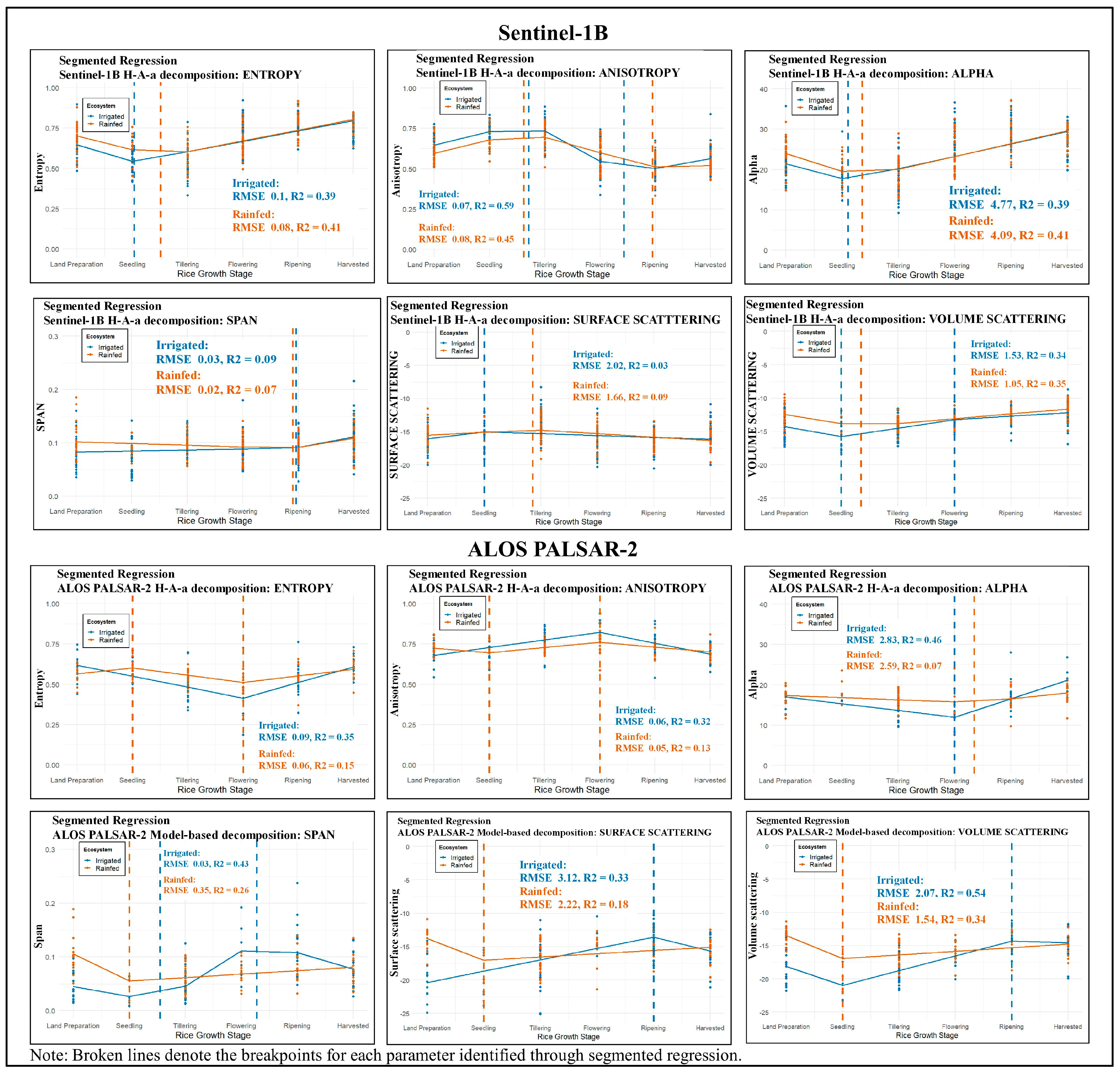 Based on the segmented regression results, S1B (entropy, anisotropy, and alpha) demonstrated better model performance with higher R2 values for parameters. This indicates more consistent sensitivity to phenological stages in both irrigated and favorable rainfed rice ecosystems. Meanwhile, ALOS2 showed stronger performance for parameters such as span and volume scattering, especially in irrigated rice systems. This shows that ALOS2 is effective in modeling heterogeneity and surface scattering.