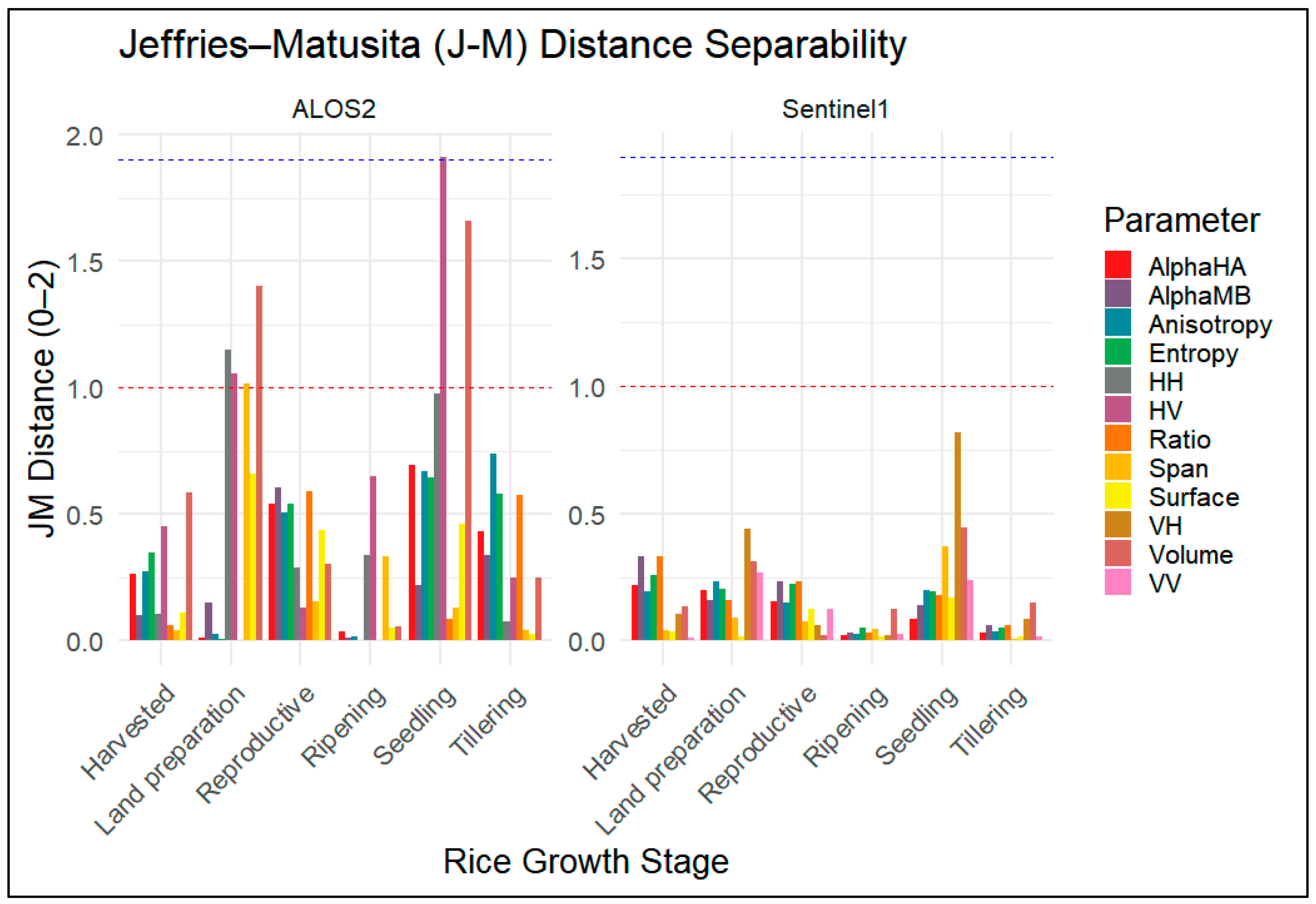 Figure 8). Overall, ALOS2 showed higher separability than Sentinel-1, which reflects the greater sensitivity of the L-band to surface roughness and moisture variations. The seedling stage exhibited the highest separability, particularly in ALOS2 HV polarization (J-M = 1.91, excellent) and volume scattering (J-M = 1.66, moderate), likely due to strong contrasts in water management and surface conditions between irrigated and favorable rainfed rice. Moderate separability was also observed during land preparation, when differences in soil moisture and flooding conditions were noticeable. Irrigated rice fields are typically flooded during land preparation, while favorable rainfed rice fields flood only after rainfall events. In contrast, S1B parameters showed consistently low J-M values (<1.0), indicating poor discrimination, especially in later growth stages where the canopy structures of both ecosystems become similar. Among all parameters, HV backscatter and volume scattering were the most discriminating features, highlighting their potential for distinguishing rice ecosystems during early phenological stages.