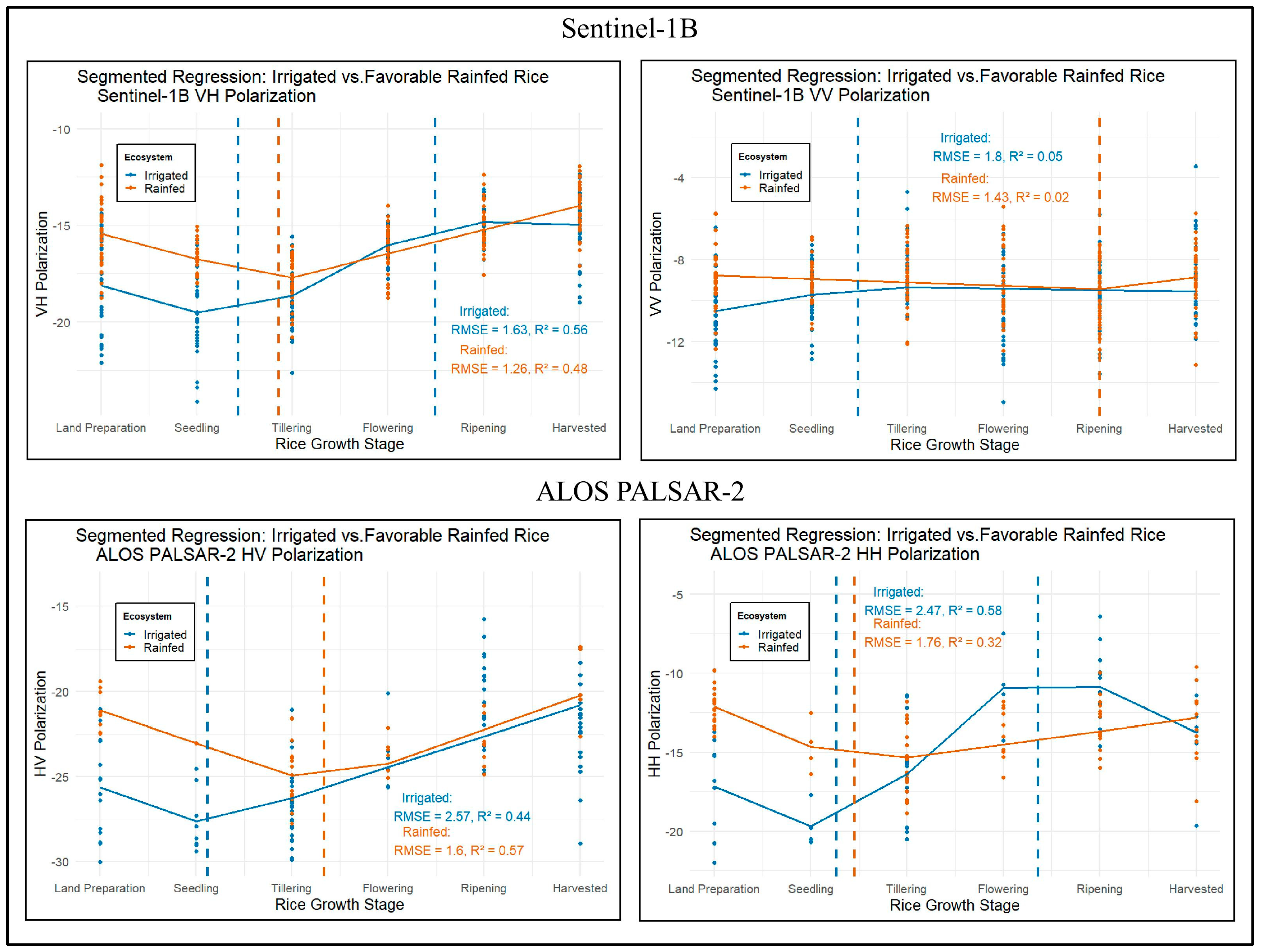 Figure 4) showed the time-series backscatter data from S1B (VV and VH polarizations) and ALOS2 (HH and HV polarizations) over the monitoring fields in irrigated and favorable rainfed rice ecosystems. Each line represented different monitoring fields while the black line indicated the mean backscatter in each satellite acquisition. Collectively, these graphs illustrate temporal variations in radar backscatter in relation to rice phenological stages and precipitation patterns. The irrigated rice ecosystem showed a relatively stable and coherent backscatter trend, suggesting uniform crop growth due to irrigation despite field variation. The temporal backscatters in VH polarization (S1B) and HH and HV polarizations (ALOS2) showed the unique backscatter characteristics of rice, and low backscatter values during establishment, with gradual increases from tillering to the reproductive phase and a decline at maturity to the harvesting stages. VV polarization was less sensitive to the phenological changes in the rice fields. Furthermore, based on the results of the segmented regression analysis in the different polarizations, VV polarization showed a low model fit, 0.03 and 0.02 in irrigated and favorable rainfed rice, respectively (