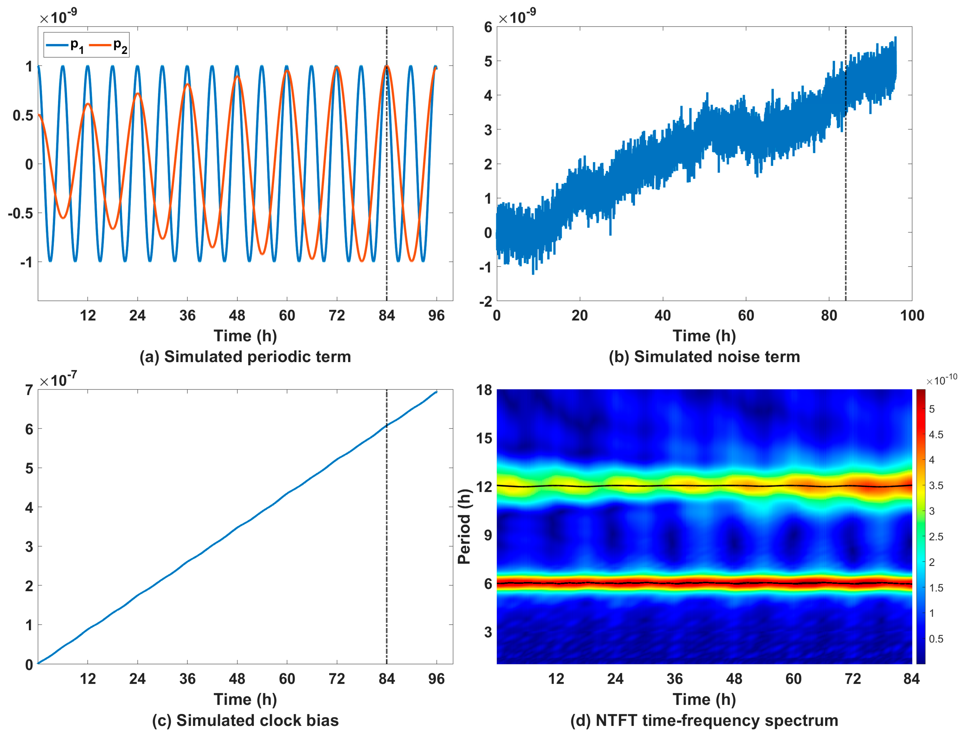 - Step 1: Use the least squares method to fit the clock bias data , obtaining the trend term . Subtract the trend term to obtain the residual sequence containing periodic terms and noise, .