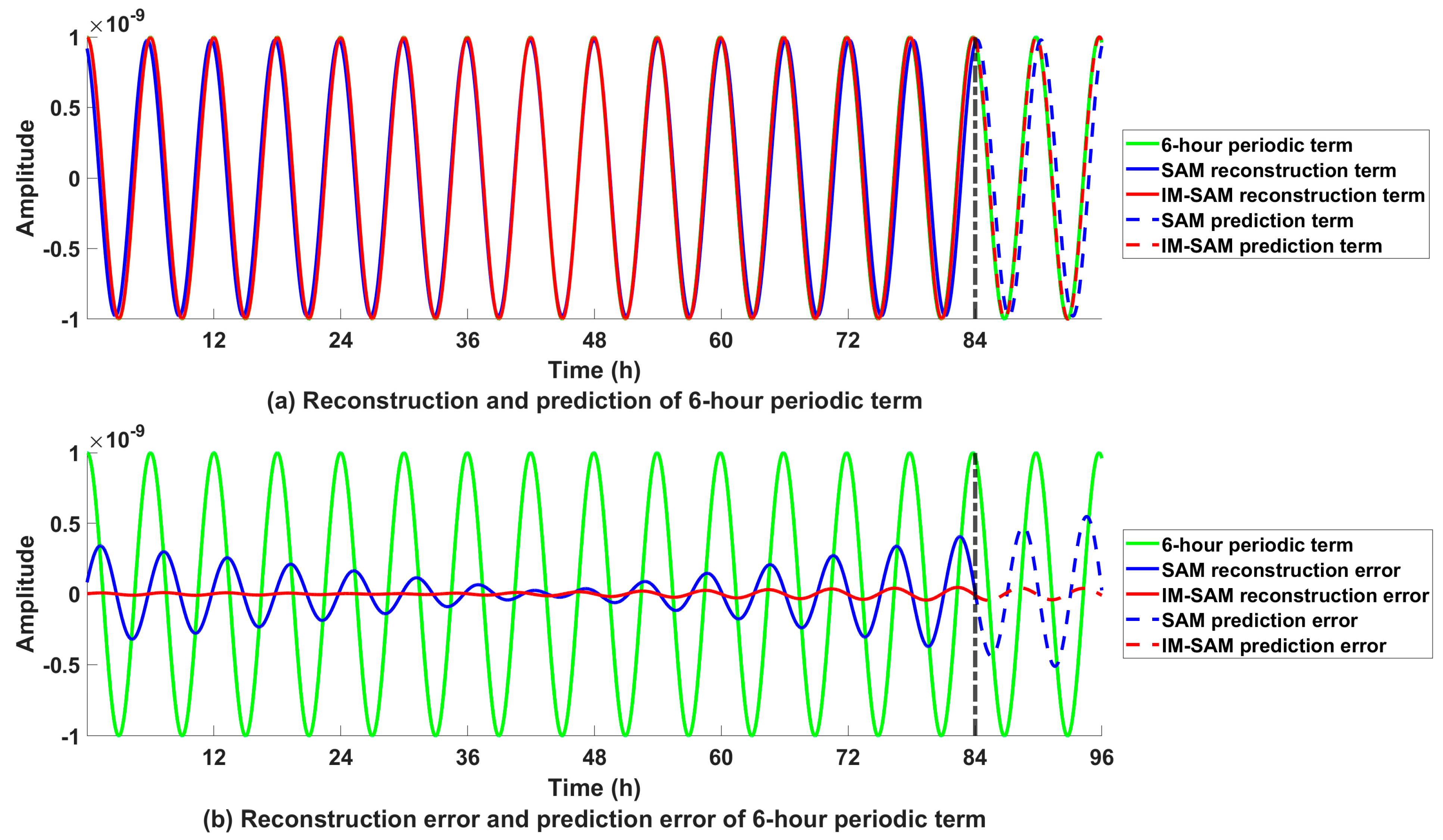 - Traditional models (GM, KFM, and QPM) do not model periodic terms, so their prediction errors exhibit significant periodic fluctuations. Although SAM partially mitigates these fluctuations through global fitting, its performance deteriorates in the presence of frequency drift or sudden changes. In contrast, IM-SAM is able to adaptively capture the latest periodic dynamics at the edge of the prediction boundary, significantly reducing prediction errors and making them more stable.