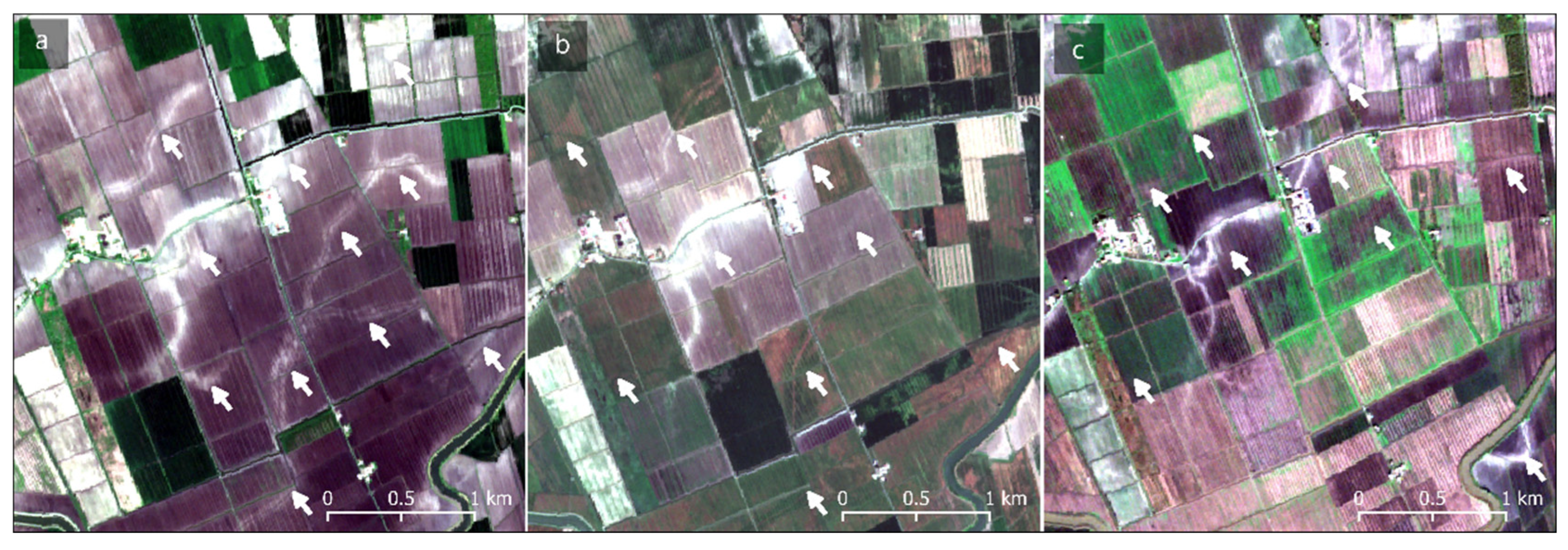 - Kaimaris, D.; Patias, P.; Tsakiri, M. Best Period for High Spatial Resolution Satellite Images for the Detection of Marks of Buried Structures. Egypt. J. Remote Sens. Space Sci. 2012, 15, 9–18. [Google Scholar] [CrossRef]
