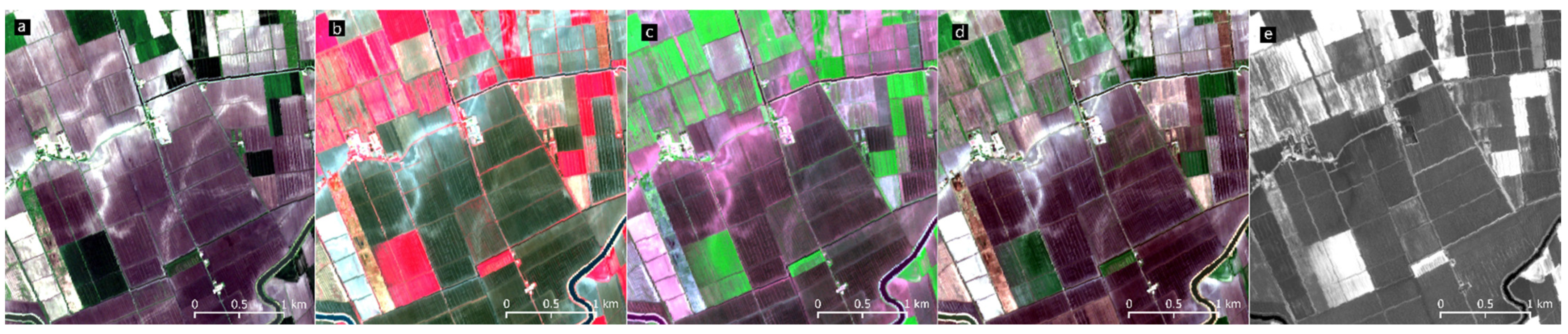 - Shi, T.; Xu, H. Derivation of Tasseled Cap Transformation Coefficients for Sentinel-2 MSI At-Sensor Reflectance Data. IEEE J. Sel. Top. Appl. Earth Obs. Remote Sens. 2019, 12, 4038–4048. [Google Scholar] [CrossRef]