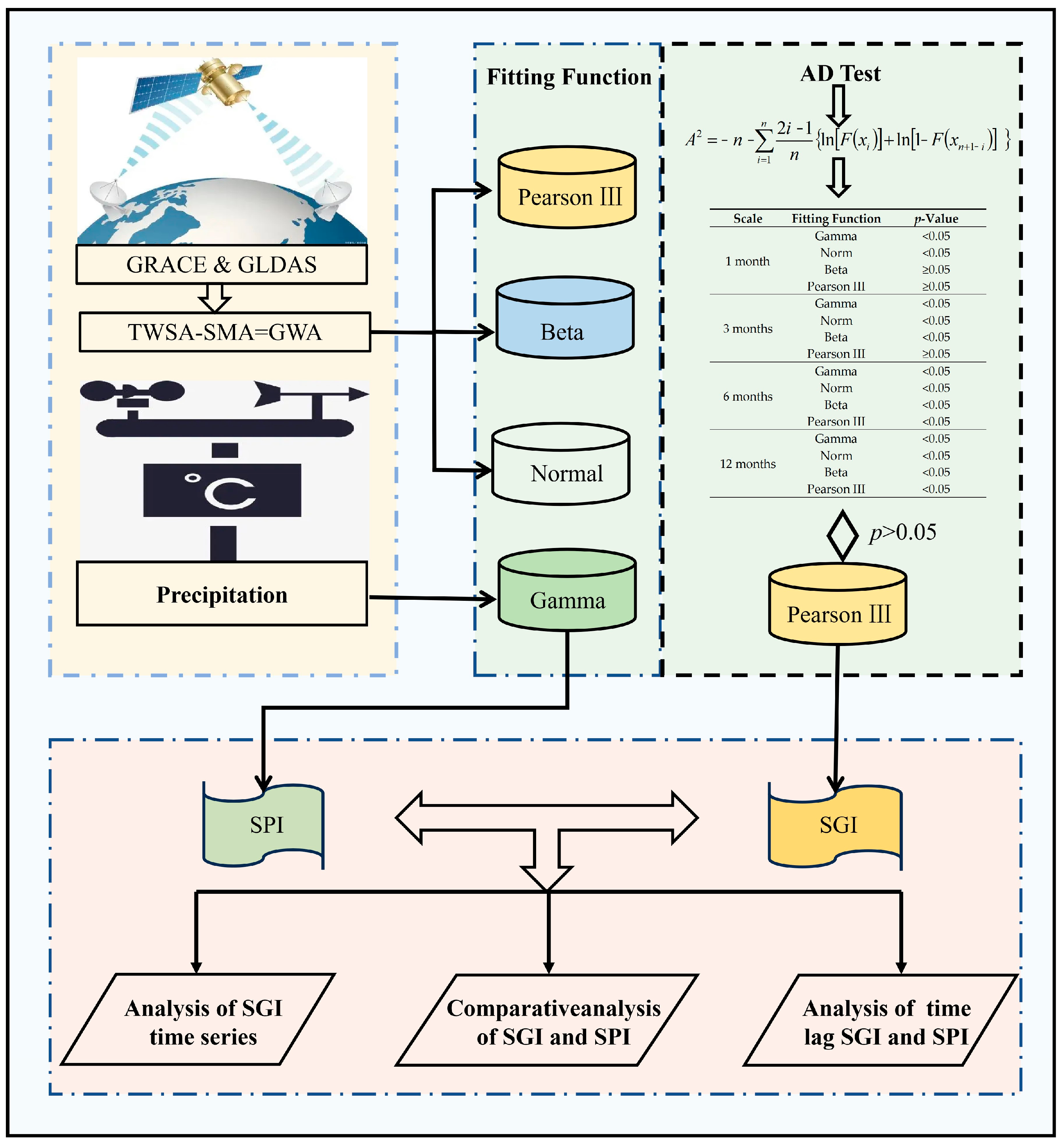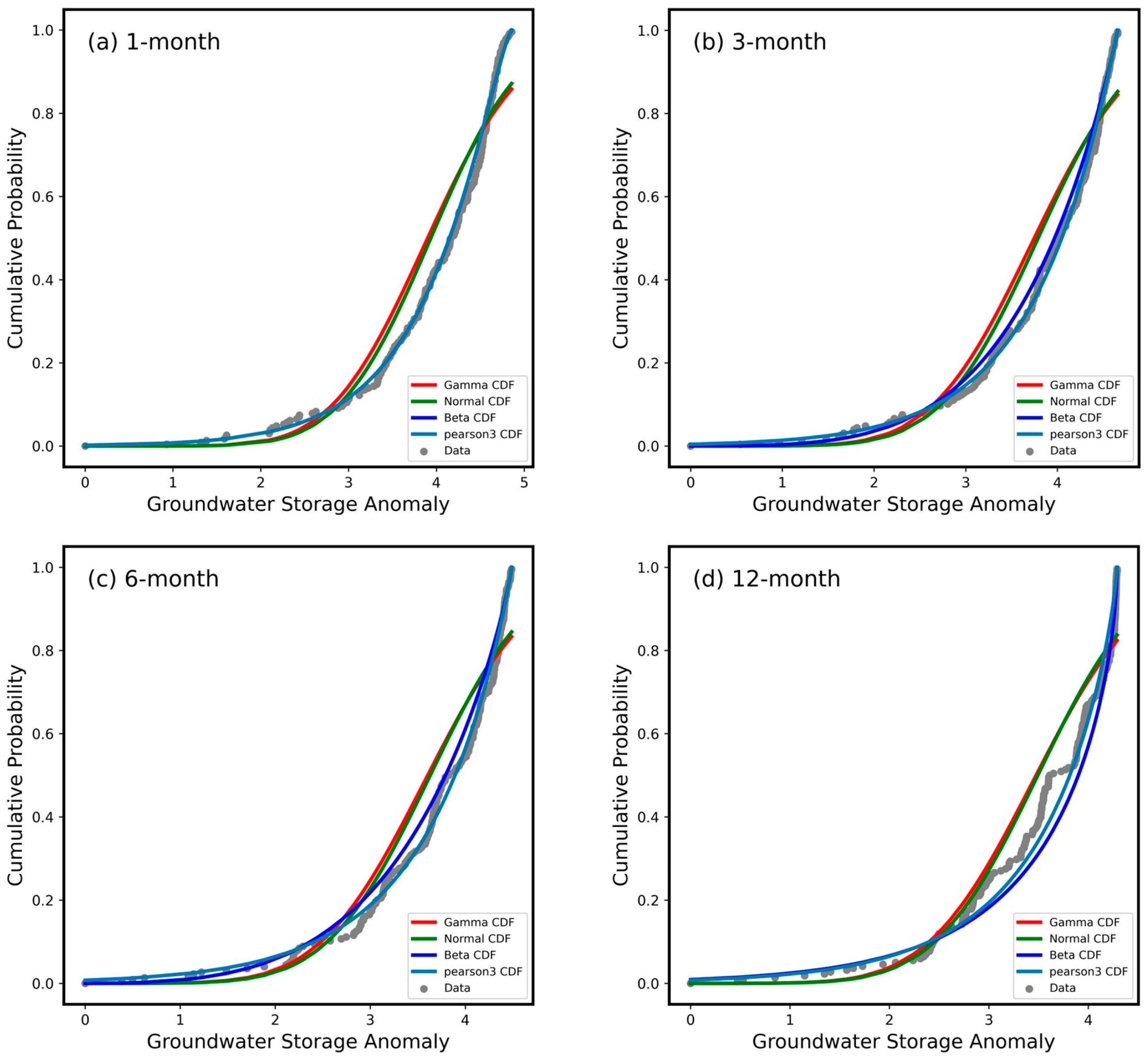 - Based on GRACE-derived groundwater storage anomaly data, the Anderson–Darling test revealed that the Pearson III distribution function provides the best fit for calculating the standardized groundwater index (GRACE_SGI) across different time scales, significantly improving accuracy.