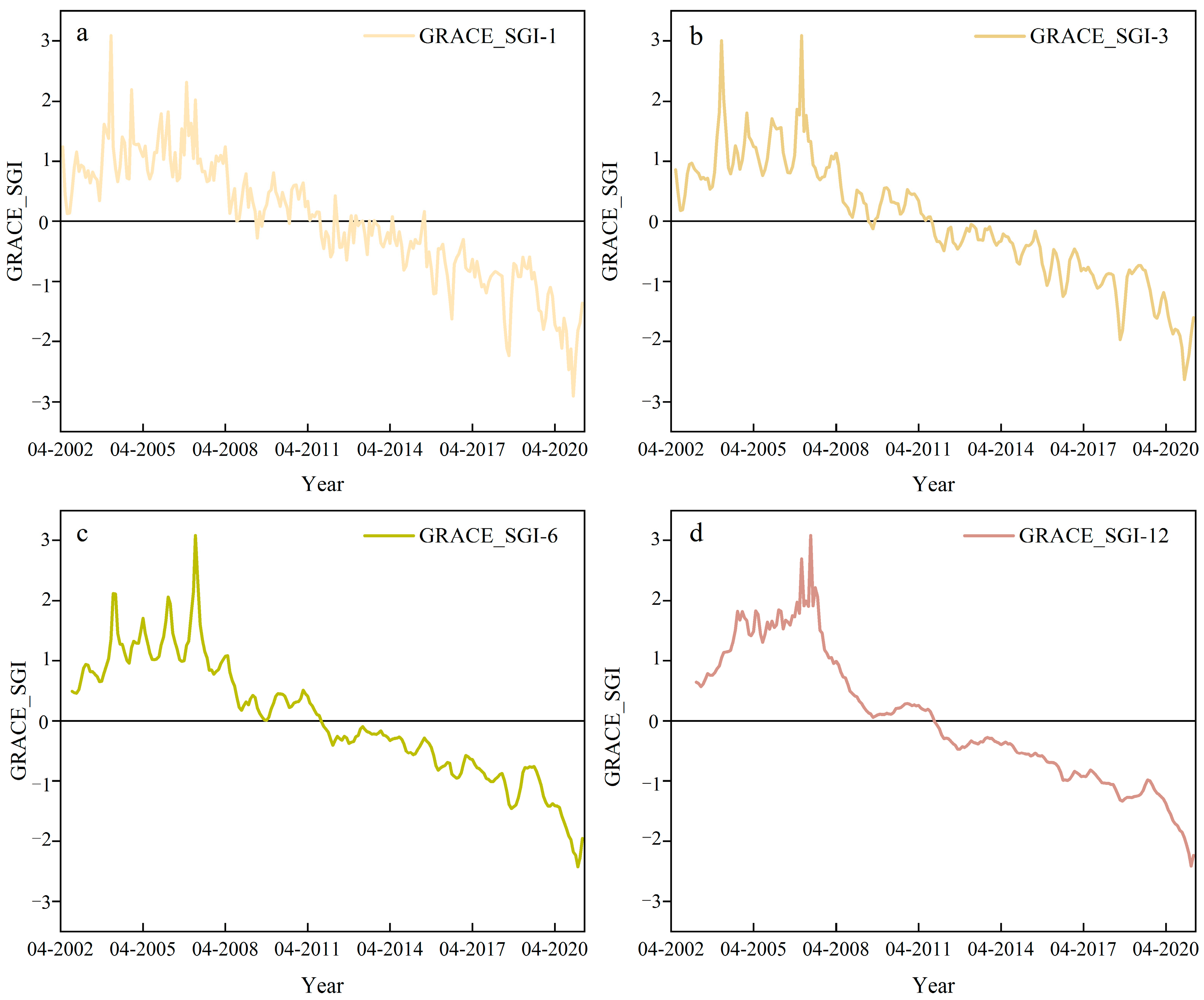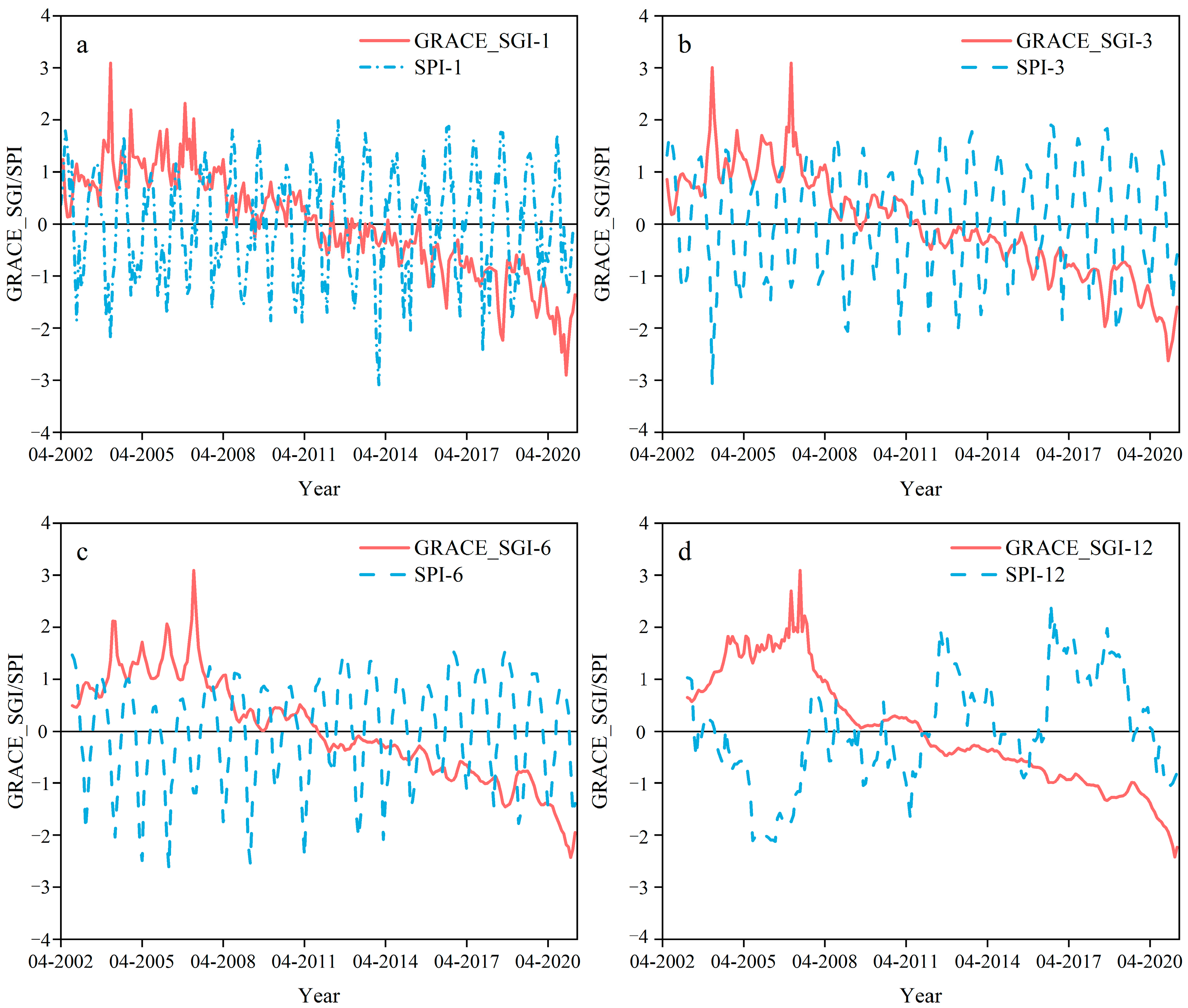 - Cross-correlation analysis between the GRACE_SGI and the standardized precipitation index (SPI) demonstrated a notable time lag effect, with lag times of up to 12 months being observed at longer time scales, indicating a delayed response of groundwater levels to precipitation changes.