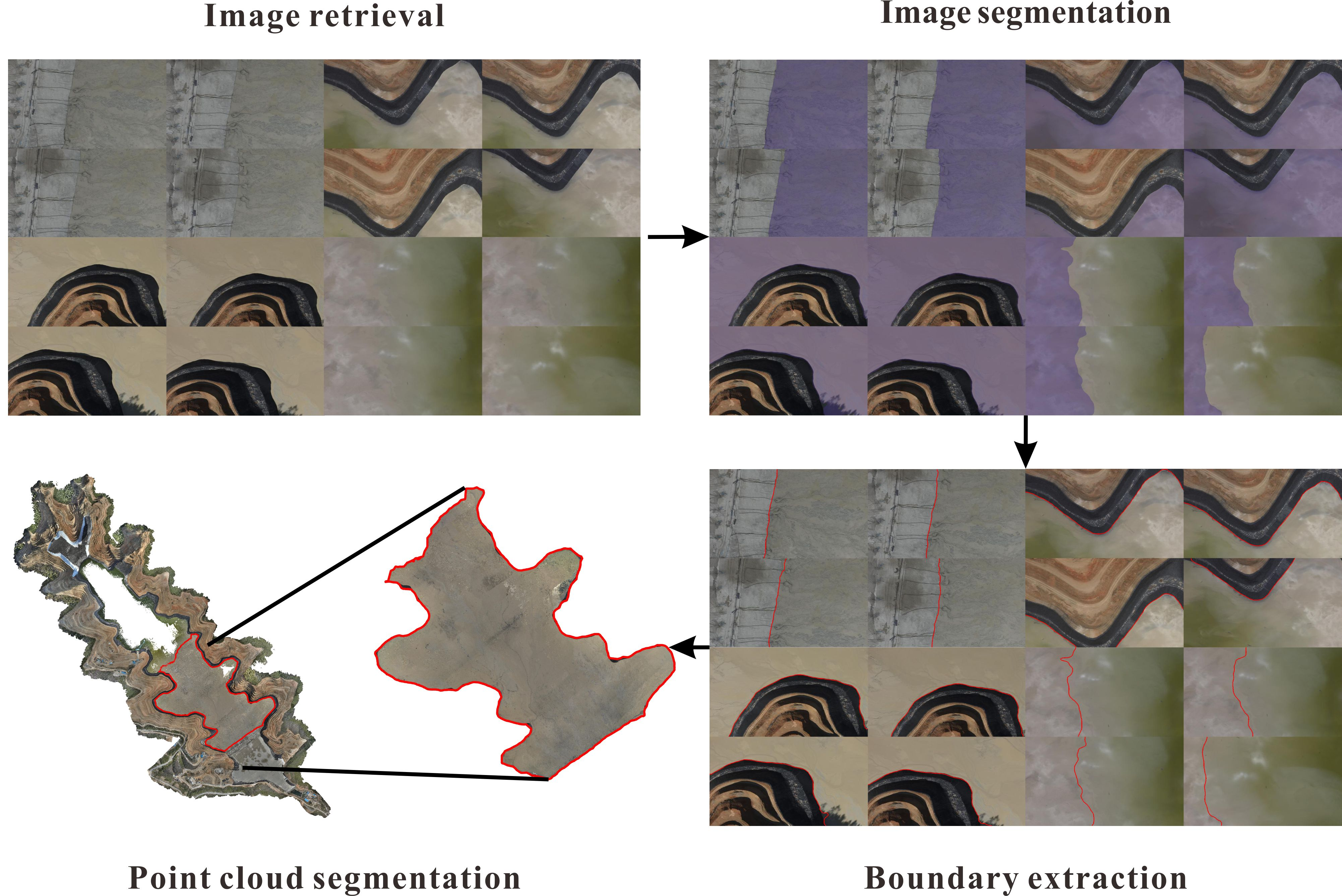 To overcome the limitations of existing 2D image methods in spatial quantification and the limitations of direct point cloud methods in robust semantic identification, this study develops a semi-automatic workflow for dry beach extraction in tailings ponds based on UAV photogrammetry and 3D reconstruction. The proposed framework establishes an integrated pipeline of “boundary image retrieval–semantic segmentation–3D back-projection–dry beach monitoring”. By utilizing the projection matrix derived from photogrammetric reconstruction, the 2D boundaries are accurately projected into 3D space, generating geometrically explicit and measurable 3D boundaries and corresponding dry beach point clouds. The strategy fully exploits the maturity and high accuracy of image-based deep learning and the spatial expressiveness of point clouds, while compensating for the inherent lack of spatial information in 2D methods and avoiding the high cost associated with direct point cloud deep learning. Such capabilities facilitate key applications in tailings pond management, including safety assessment of dams and monitoring of tailings deposition.
